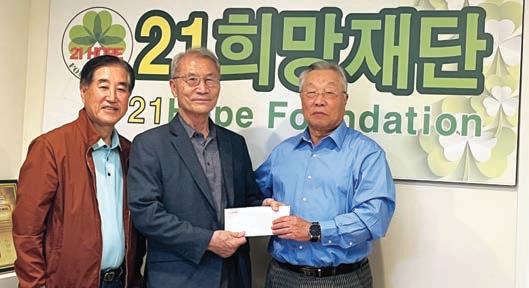 왼쪽 21희망재단 김용선 이사, 가운데 윤도 근 선교사, 오른쪽 김준택 재정이사 21희망재단 윤도근 선교사에 후원금