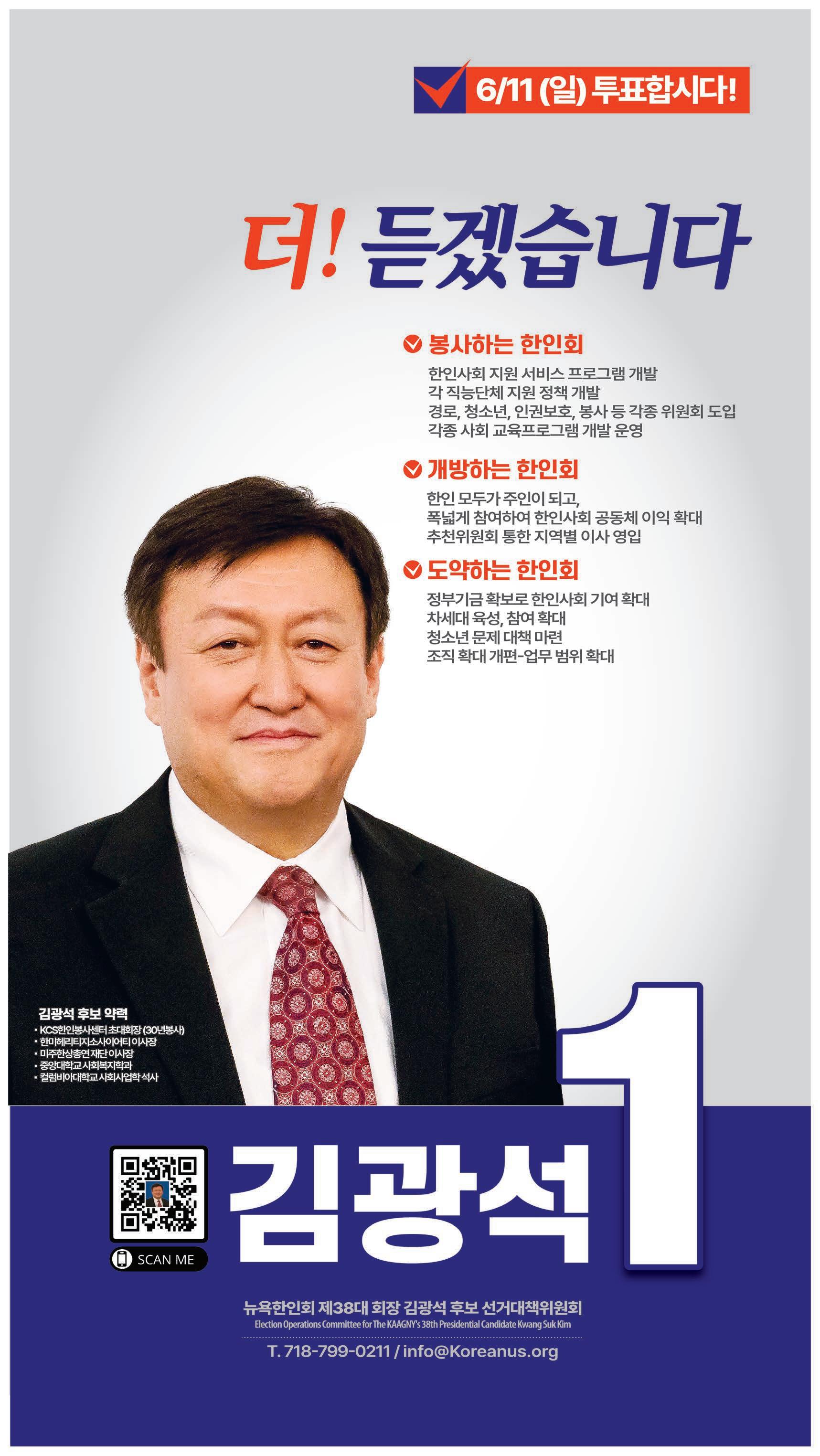 부착하고, 두 진영에 선거운동을 허용했다.선관위는 후보자 합동 연설회를 6월 1일(목) 오후 1시 뉴 욕한인회관(149 W. 24 St New York NY 10011) 6층 강당에서