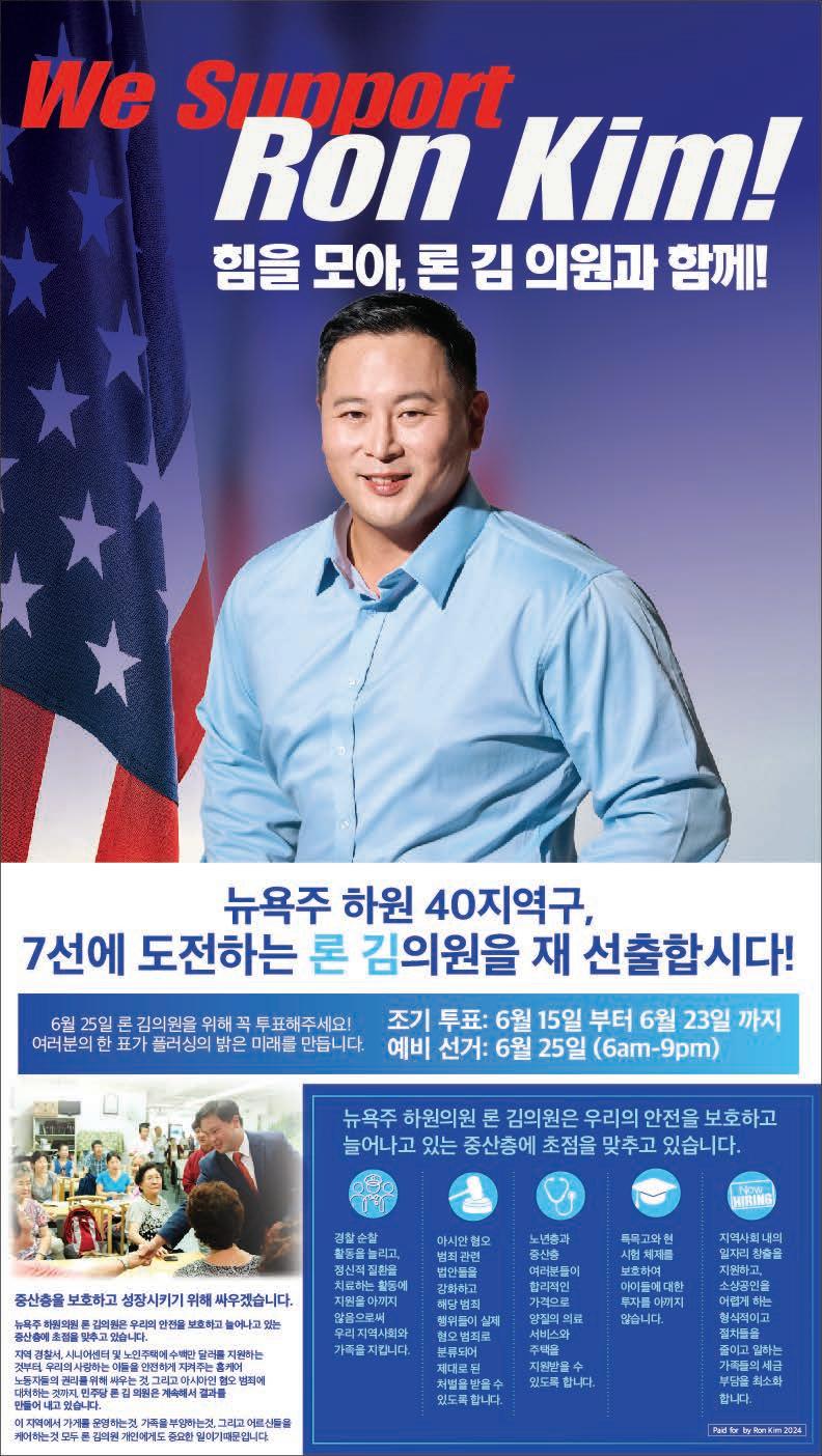 코윈 뉴욕지부(KOWIN NY, 회장 류은주)는 13일 뉴욕한국문화원 대회의실에서, 2024년 여성가족부 주최 글로벌 코윈대회 논의 등을 포함한 정기총회를 개최했다. 이날 정기총회 사전 행사로 문화원의 주요 비전과 프로그램에 대한 안내를 받으며 신청사의 주요 시설 을 단체 관람하고 김천수 문화원장과 대화를 통해 상호협력 의견을 교환했다. [사진 제공=KOWIN 뉴욕지부] 코윈 뉴욕지부, 뉴욕한국문화원 신청사 관람 후 정기총회 한인 최초의 여성 뉴저지주 하원의원이자, 법사위원장을 역임 중인 엘렌 박 의원 후원회가 12일 뉴저지 포트리에서 열렸다. 이 날 행 사에는 한인 시의원, 교육위원 및 뉴저지 한인단체장, 개인 후원자 등이 참석, 엘렌 박 의원의 그간 활동에 대해 설명을 듣고, 엘렌 박 의원의 앞으로의 정치 활동에 대해 힘을 실어주는 시간을 가졌다. [사진 제공=엘렌 박 의원 캠페인‘Park for Assembly] 엘렌 박 뉴저지주 하원의원 후원회… 활동 보고·지지 당부 뉴욕주 하원의원 25선거구에 공화당 후보로 출마한 케네스 백 후보가 중국계 교계 및 중국계 인 사들로부터 공식지지를 받으면 서, 25일 예비선거를 앞두고 지지 기반을 더욱 공고히 하고 있다. 또 한케네스 백 후보는 중국인 공화 당 유권자 사이에서도 높은 지지 율을 보이고 있어는 예비선거에 서 승리 가능성을 더욱 높이고