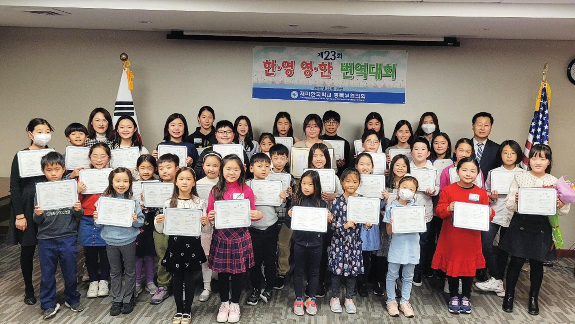 제22회 전미주한인체육대회 뉴욕조직위원회(공동위원장 곽우천, 이석찬)는 26일 퀸즈 플러싱에 위치한 뉴욕조직위 사무실에서 내년 6월23일부터 사흘간 롱아일랜드 나소카운티 일원에서 열리는 제22회 전미주한인체육대회의 성공적인 개최를 위해 전체 본부장단 회의를 개최했다. 곽우천 공동조직위원장(앞줄 가운데)을 비롯한 임원들이 힘차게 파이팅을 외치고 있다. 앞줄 오른쪽부터 이황용 업 무조정본부장, 박우하 사업본부장, 김종덕 선수단지원본부장, 김일태 체전추진단장, 곽우천 공동조직위원장, 양창원 대회특별사업 지원단장, 홍하나 여성청소년본부장 △연락처: 제22회 전미주한인체육대회 뉴욕조직위원회 사무국 office@ny23.org, nysports2023@gmail.com ‘뉴욕답게 전미주체전 확실히 준비하겠습니다” 제22회 전미주체전 뉴욕조직위원회 제2차 본부장단 회의 지난 23일 제23회 한영·영한 번역대회 시상식이 23일 뉴욕총 영사관에서 거행됐다. 이번 번역대회는 재미한국학 교 동북부협의회 소속 회원교 중 35개교에서 218명이 참석해 그 열 기가 뜨거웠다. 이날 시상식에서는 대상 도예 원(뉴욕기둥교회 한국 문화학교) 학생을 비롯한 각 부문별 수상자 등 총 50명의 학생이 수상의 영광 을 누렸다. 대상을 수상한 도예원 학생은 “뉴욕에서 태어났으며 4살 때까 지 EBS교육방송과 한글책자로 한글공부를 열심히 해 정작 미국 공립학교를 들어가서는 화장실을 가고싶다는 말도 영어로 못할 정 도였으나 점차 영어가 익숙해지 면서 한국어를 잊어버리게 되었 다”며 이중 언어 구사능력을 갖추 기가 쉽지 않음을 자신의 경험을 토대로 설명했다. 도예원 학생은“한국학교를 열심히 다니고 한국 예능 방송을 보며 꾸준히 번역대회에 참가한 것이 대상을 받는 원동력이 됐다” 며“최근 한국의