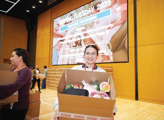 가리지 않고 100여 명 이상이 자발 적으로 참여해, 단순한 물품 포장 을 넘어 협업·공유·지역 공동체 이해 확대라는 의미를 더했다. 직원들은 테이블별로 자연스 럽게 역할을 나누어 식료품 구성 체크, 박스 포장 및 제품 배치, 최 종 검수, 메시지 카드 넣기 등의