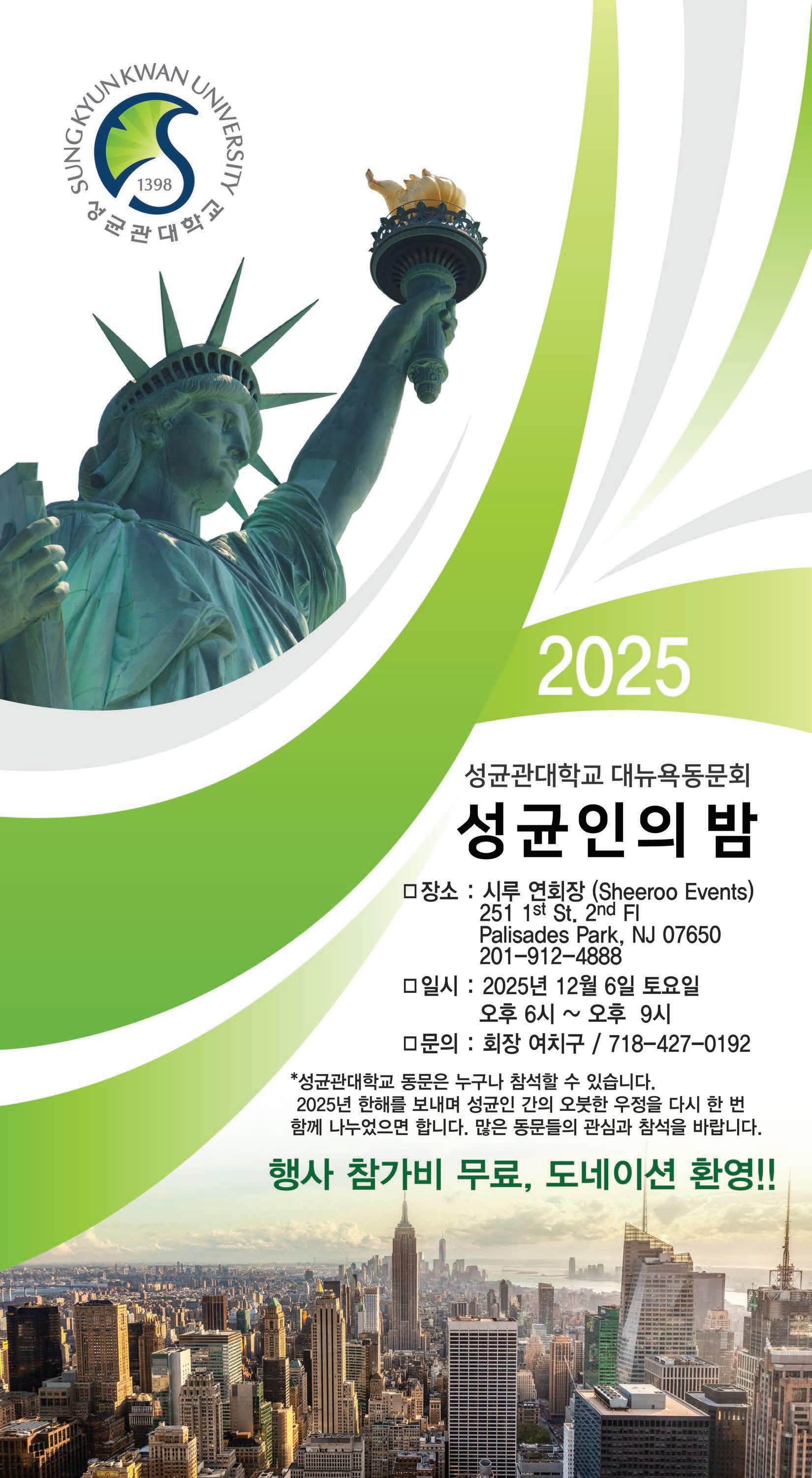 송년회 1부에서는 감사를 선임 하고 차기 임원들을 소개한 후 장 학금 수여후 기념촬영을 한다. 2부에서는 음대 동문들의 축하 공연이 펼쳐진다. 3부는 여흥과 경품추첨이 진행된다. △ 장소: 더블트리호텔 2117 Route 4E Fort Lee, NJ 07024 △ 연