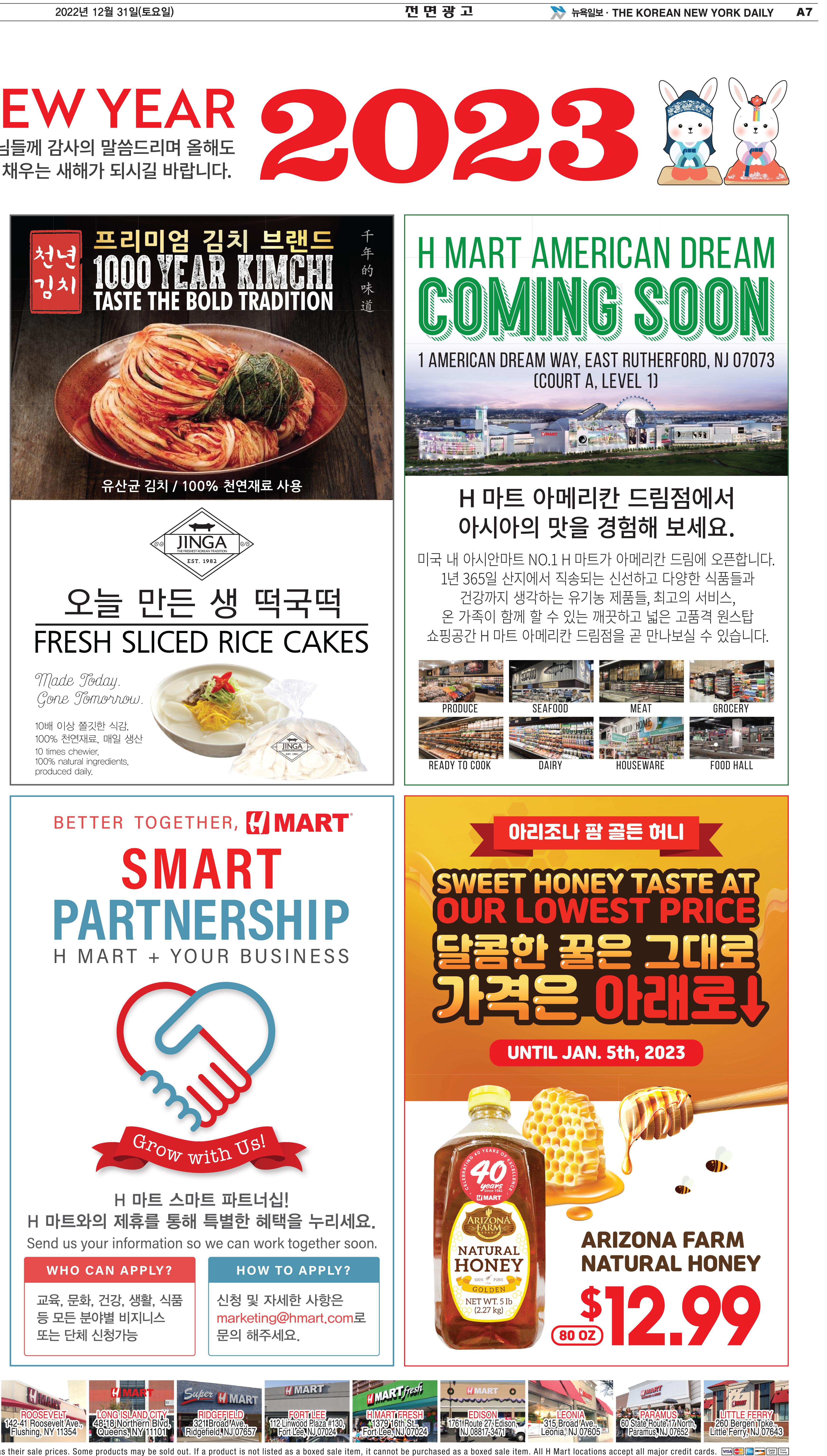 定)’을 깨고 긍정(肯定)’의 새 삶을 창조해 나가자는 뜻이다. 이제 우리들은 가슴속으로 ‘제야의 종’을 더 크고 힘차게 울 려야 할 것이다. 2022년의 온갖 어 둠과 부정(否定)을 떨쳐버리고 밝 음과 긍정(肯定)으로 새 출발을 다짐해야 한다. 한국에서는 2022 년 올해의 4자성어로‘과이불개 (過而不改)’를 택했다. 논어에 나 오는 말로 잘못을 하고도 고치지 않는다’뜻이다. 잘못이 드러나도 서로의 탓만 하는 한국 지도층 인 사들은 물론 많은 국민들의 언행 을 지적하는 말이다. 여당은“이 전 정부 탓”야당은“대통령 탓” 이라며 고칠 생각을 하지 않고, 또 10.29 참사와 같은 후진국형 사고 가 발생해도 책임지려는 정치가 안 나오고 있다고 지금의 현실을 꼬집었다. 새해에는 이래서는 안된다. 이 제 못된 버릇을 과감히 버리고 ‘내탓이요!’내가 책임지면서 새 세상 2023년을 만들어 가야한다. 이제 새 하늘이 열리고 희망의 2023년 계묘년癸卯年) 새 태양이 떠오를 것이다. 새해, 밝음을 향해 달려가자 뛰고 뛰고 또 뛰자 <송의용 기자> “잘 가라 2022”… 제야의종 소리에 맞춰‘새해’‘밝음’부르자 < 미국COVID-19 집계 : 12월 30일 오후 6시30분 현재 Worldometer발표 > 102,510,47830,3021,117,956 6,742,7017,49775,235 2,926,8343,65435,510 2022년 마지막 날인 31일 오후 11시 30분부터 서울 종로 보신각에서 코로나19 팬데믹으로 중단됐던 제야의 종(除夜의 鍾) 타종행사가 3년 만에 다시 열린다. 서울시장과 시민대표 10명 등 총 14명이 참여해 3개 조를 이뤄 각 11번씩 총 33번에 걸쳐 제야의 종을 울린다. 뉴욕주정부가 23일 이민자 신 분에 따른 고용주, 건물주 등의 직 원과 세입자 차별을 금지하는 법 을 제정했다. 뉴욕주 인권법에 시 민권 또는 이민 신분에 따른 차별 은 불법이라는 규정을 덧붙이는 것이다. 이에 따라 검찰총장은 이 민자 신분 차별 행위를 범죄로 기 소할 권한을 갖게 됐다. 캐시 호컬 뉴욕주지사는 이같 은 내용을 담고 있는 뉴욕주 인권 법개정 법안 S6586A에 서명했다. 이에 따라 고용주나 랜드로드 혹 은 기타 공공 시설 운영자 등이 주민들을 상대로 이민 신분에 따 라 불이익을 주는일을 할 수 없게 된다. S6586A법안에는“뉴욕 주 내 에서 주민들의 이민 신분에 따른 차별은 용납할 수 없는 행위이며 만약 이에 대한 이의를 제기할 경 우 뉴욕주 인권국이 실제 차별 행 위가 있었는 지를 조사해야 한다” 고 명시 돼 있다. 법 제정에 앞장선 존 리우 뉴 욕주 상원의원과 이에 협조한 카 탈리나 크루즈 뉴욕주 하원의원 은 29일 플러싱 도서관 앞에서 회 견을 열고 “이민 신분에 따른 차 별 철폐를 현실화 시킨 캐시호컬 뉴욕 주지사의 법안 서명에 박수 를 보낸다”고 환영했다. 이 자리에서 민권센터 박우정 이민자 정의 활동가는“뉴욕주 아 시안 아메리칸 7명 가운데 1명이 서류미비자”라며“서류미비자 합 법화 운동을 펼치고 있는 이민자 커뮤니티에게 이 법의 제정은 큰 승리”라고 밝혔다. 박우정 활동가는 이날 회견에 서 누가 우리의 영웅들이 될 것 인가”라는 자신의 시를 낭송하며 이민자 커뮤니티의 권익 향상을 위해 앞으로도 땀 흘릴 것을 다짐 했습니다. 취업·렌트 때 이민자 신분에 따른 차별 금지 캐시 호컬 지사, 뉴욕주 인권법개정 법안 S6586A서명 뉴욕주 인권법개정 법안 S6586A제정에 앞장선 존 리우 뉴욕주 상원의원과 이에 협조 한 카탈리나 크루즈 뉴욕주 하원의원은 29일 플러싱 도서관 앞에서 회견을 열고“이민 신분에 따른 차별 철폐를 현실화 시킨 캐시호컬 뉴욕 주지사의 법안 서명에 박수를 보 낸다”고 환영했다. 이 자리에서 민권센터 박우정 이민자 정의 활동가도 참석해 이 법안 을 환영했다. [사진 제공=민권센터] 최고 51도 최저 42도 1월 2일(월) 1월 1일(일) 최고 52도 최저 38도 1,283.06 1,238.941,273.30 1,248.70 N/A 1,246.54 12월 31일 오후 12시 기준(한국시각) 12월 31일(토) 최고 51도 최저 47도 비 흐림 2022년 12월 31일 토요일 제보 문의 대표전화 (718) 939-0047/0082 THEKOREANNEWYORKDAILY Saturday December 31,2022 <제 5378호 > www.newyorkilbo.com 흐림