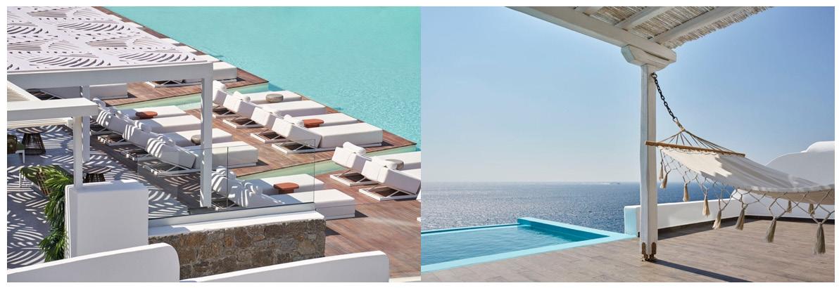 As you lounge on a sunbed at the hotel’s stunning pool, enjoy one-of-a-kind panoramic views of Mykonos’s pristine turquoise and azure waters. Savor this unique vantage as