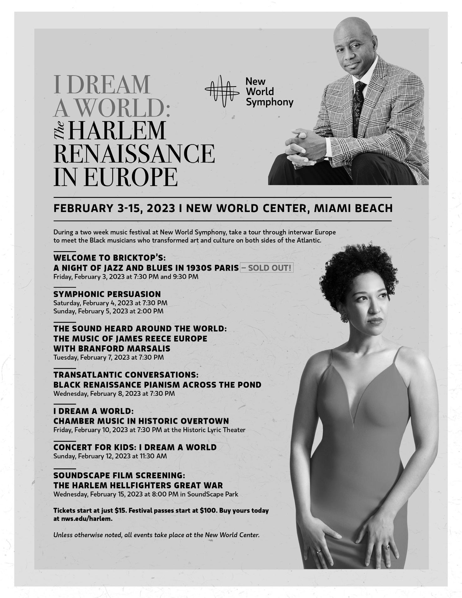 I Dream a World: The Harlem Renaissance in Europe will focus on the artists who found success in Europe between 1917 and 1935, exploring the impact of World War I, the rise and spread of Nazism, and World War II on the spread of Harlem Renaissance ideology and Black music in Europe. Festival collaborators include Dr. Tammy Kernodle (University Distinguished Professor of Musicology at Miami University of Ohio), Dr. Samantha Ege (Lord Crewe Junior Research Fellow in Music at Lincoln College, University of Oxford), Conductor William Eddins and Branford Marsalis (composer, bandleader, and GRAMMY Award-winning saxophonist). In addition to a robust series of concerts, the Festival will feature an exhibition curated by Christopher Norwood, a lecture presented by FIU/ Wolfsonian, and a film presented by the City of Miami Beach and the American Black Film Festival