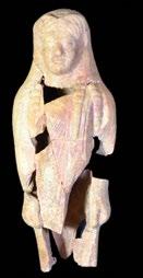 Finally, a trench against the west and south sides of Temple R (SAS U, supervised by Daniele Bursich) brought to light the foundations of Punic structures against the south side of the building, which were largely removed in the nineteenth-century excavations directed by Francesco Saverio Cavallari. Furthermore, this excavation made it possible to identify, against the west side of the temple, a deposit with numerous votive materials datable to before the mid-sixth century. Standing out among the finds are a sanguisugatype fibula and a metal chisel with a broken hollow handle for working stone and wood and with the blade well preserved and slightly curved due to wear. Among the terracottas are a clay statuette of a kouros of Samian production with extensive traces of polychromy (Figure 5) and a statuette of a banqueter. Various ivory elements were also in the deposit, including a fragment of personal ornament.