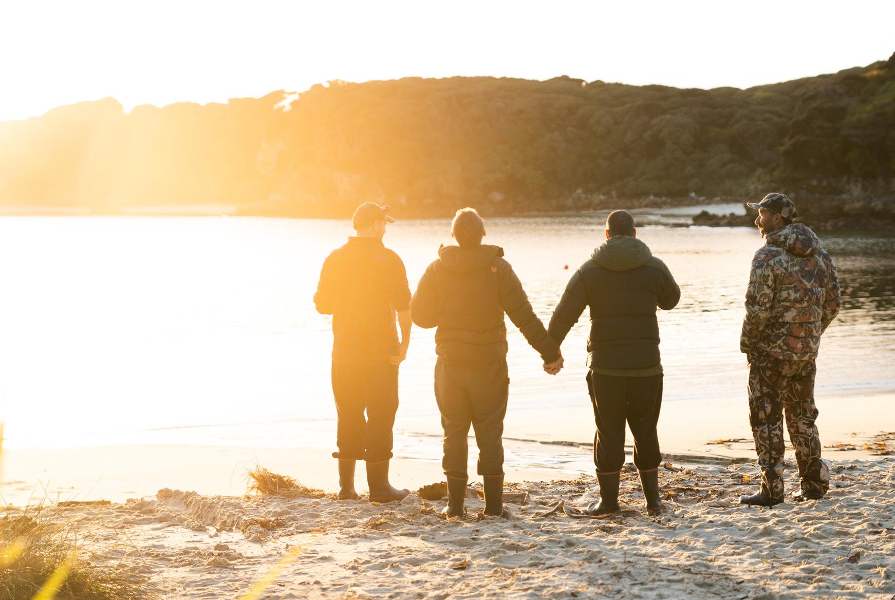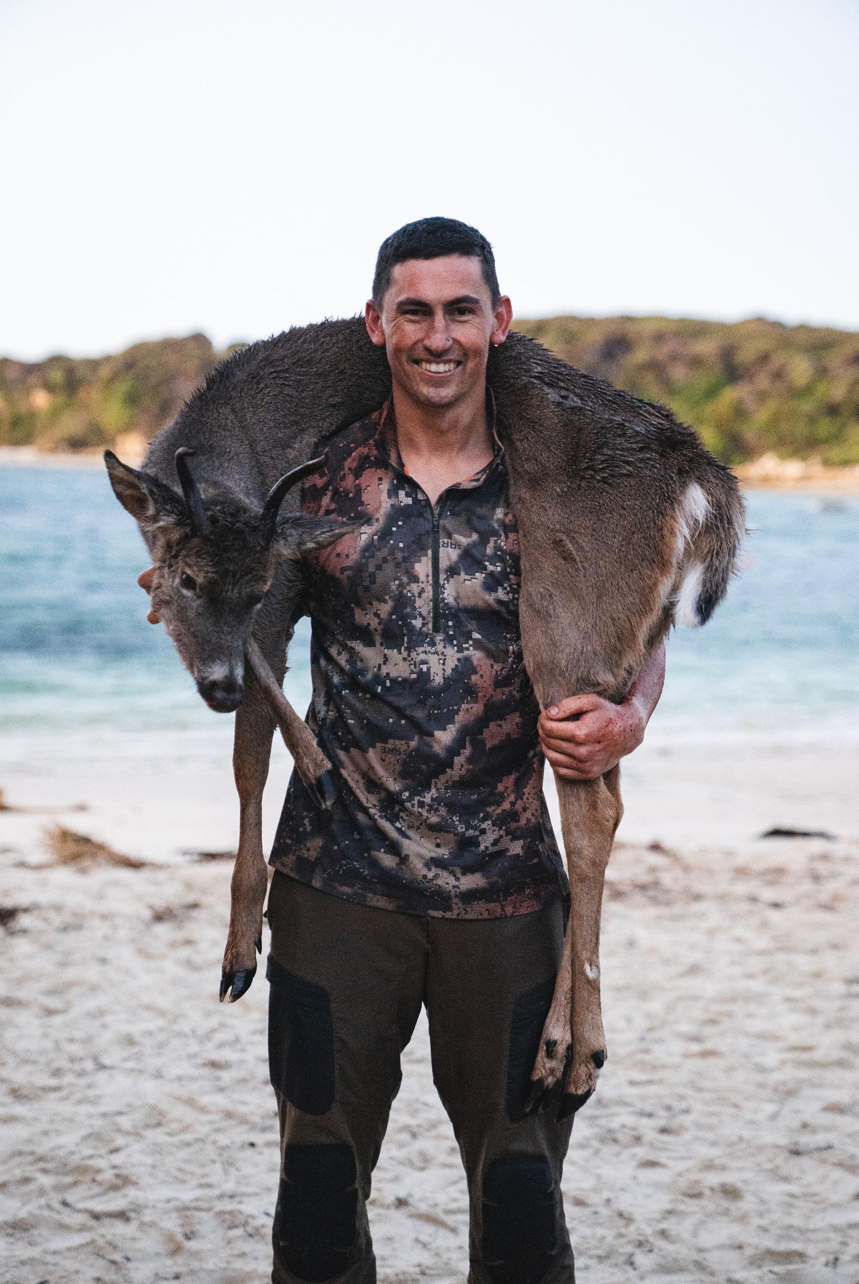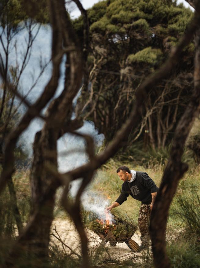 anything back to camp, we quickly learned we weren’t the only ones. A few others from our party had all but spooked one or two of the notorious grey ghosts, instilling a sense of new appreciation and humbleness about just how challenging the hunting was here, and the fact that we were in their territory and under their watch. Fortunately, however, a few of the boys had been out diving and had brought back an abundance of fish and pāua, making up for the rest of us emptyhanded hunters. We spent the night enjoying the big feed of seafood and a couple of drinks around the campfire, along with plenty of laughs and stories told.