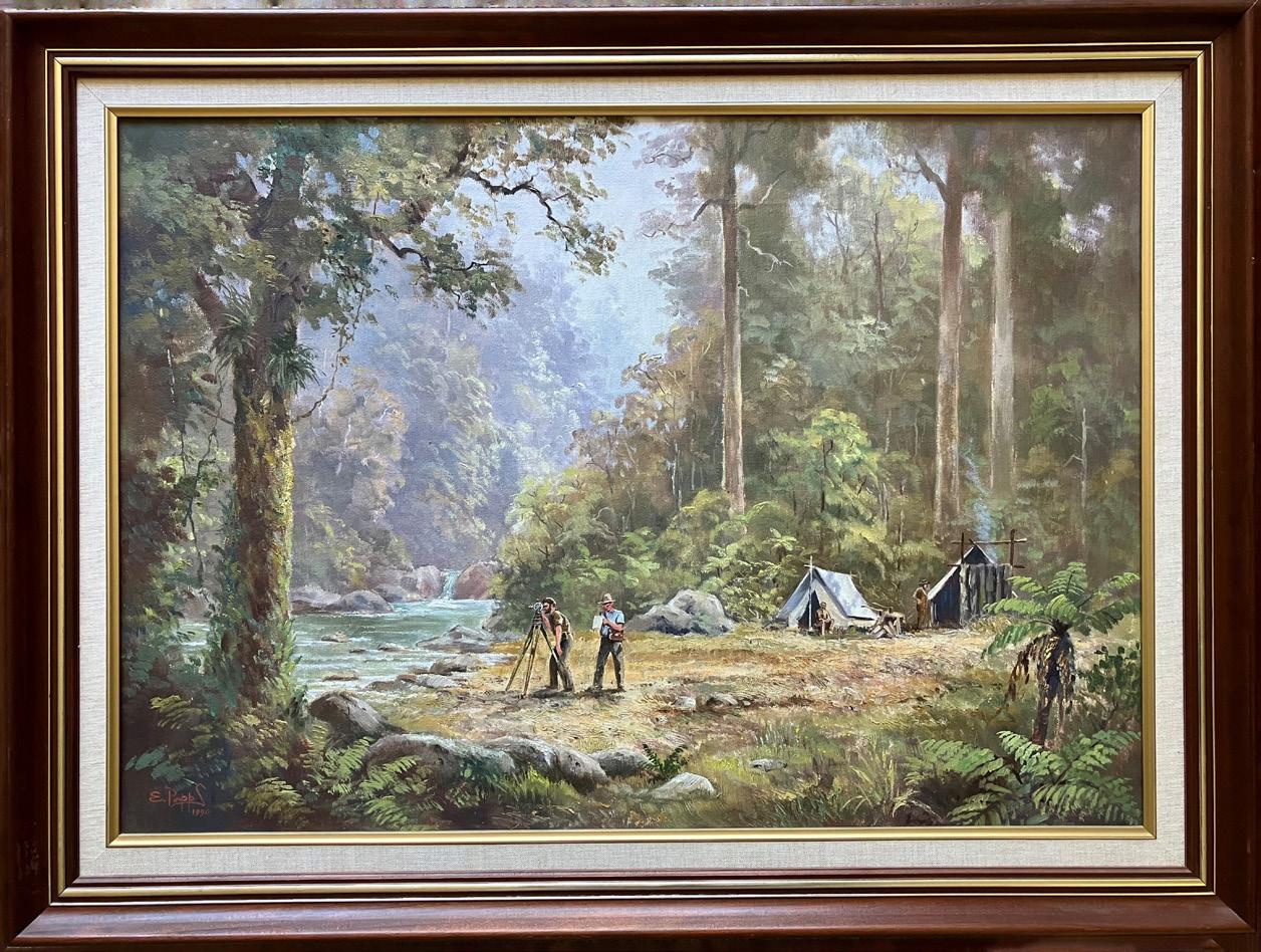The artist is Ernest Papps, a noted New Zealand landscape painter. A senior branch member recalled that the artist added a survey camp to his recent original painting, using a photo from Links in the Chain, the original Archie Bogle book. The camp certainly looks very similar to the photo of a survey camp, now on page 60 of The Measure of the Man book. It is thought that the river shown is the Hautapu River, which joins the Rangitikei River near Utiku, south of Taihape. This correlates to the description of the camp photo in the book, which says Omatane, near the Rangitikei River.