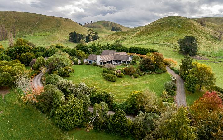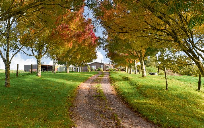 Sealed drive weaves through the land past a complex of sheds and the new equestrian arena near the entrance to the home at the top, through pasture and carbon credit qualified native trees and pristine streams.
