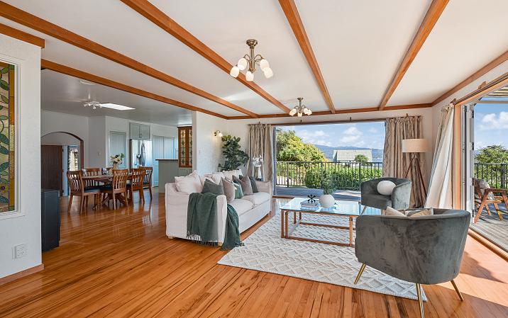 The temptation that awaits you from the front door at 65 Maungawhare Place certainly needs to be experienced to appreciate. A huge bay window welcomes you, with vast high-pitched ceilings throughout creating an open and exceptional 1970s home you will love, and friends and family won't want to leave! Concrete block and board and batten construction certainly gives this home a sense of security, and with an abundance of sunlight and airflow ensuring year-round entertaining is a breeze! The separate large lounge and family area both flow easily to the expansive grounds and deck area that overlooks the large inground pool. Entertainers will be in their element! Three large bedrooms including the Master and ensuite reside on the top level, with storage a plenty. There is an additional room off the garage plus office space, creating ample opportunity to decorate and make this a home you will enjoy for many years to come.