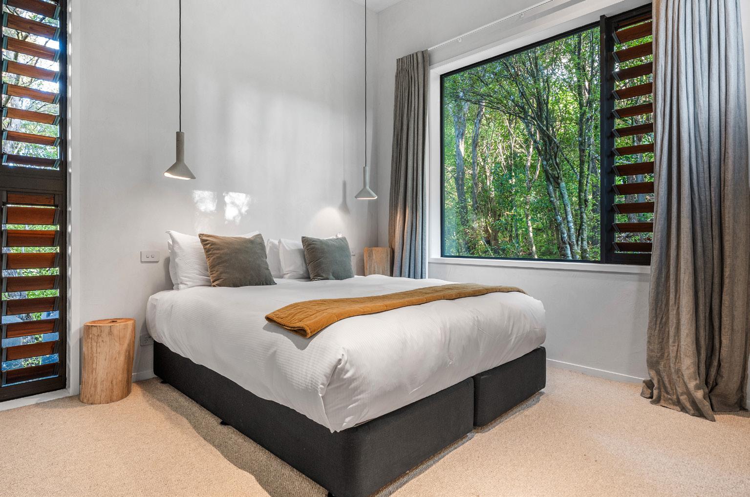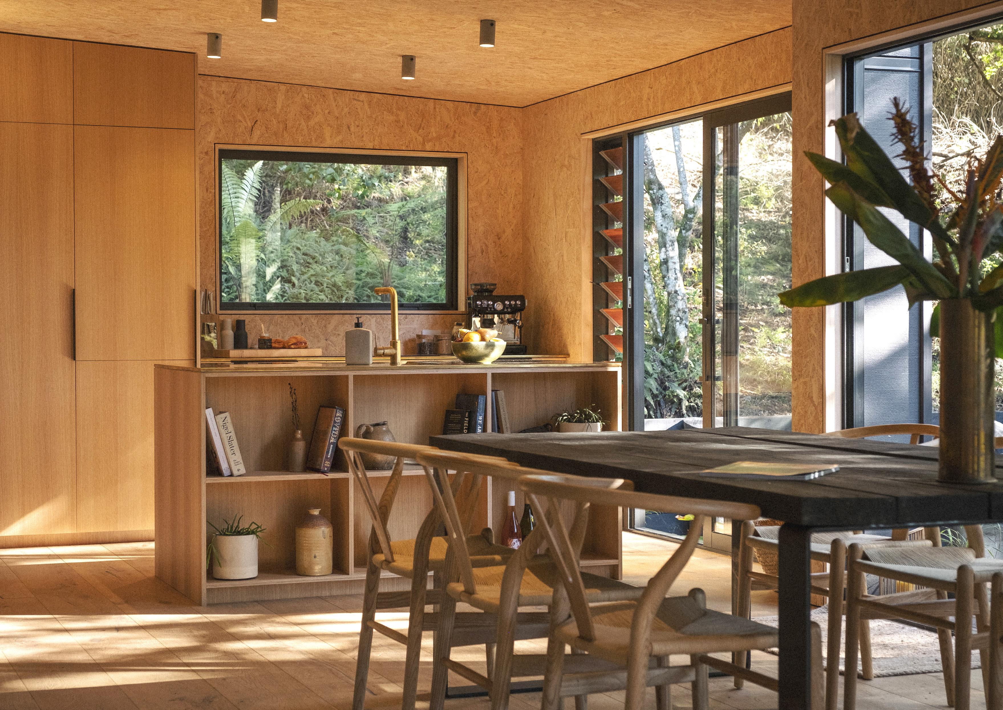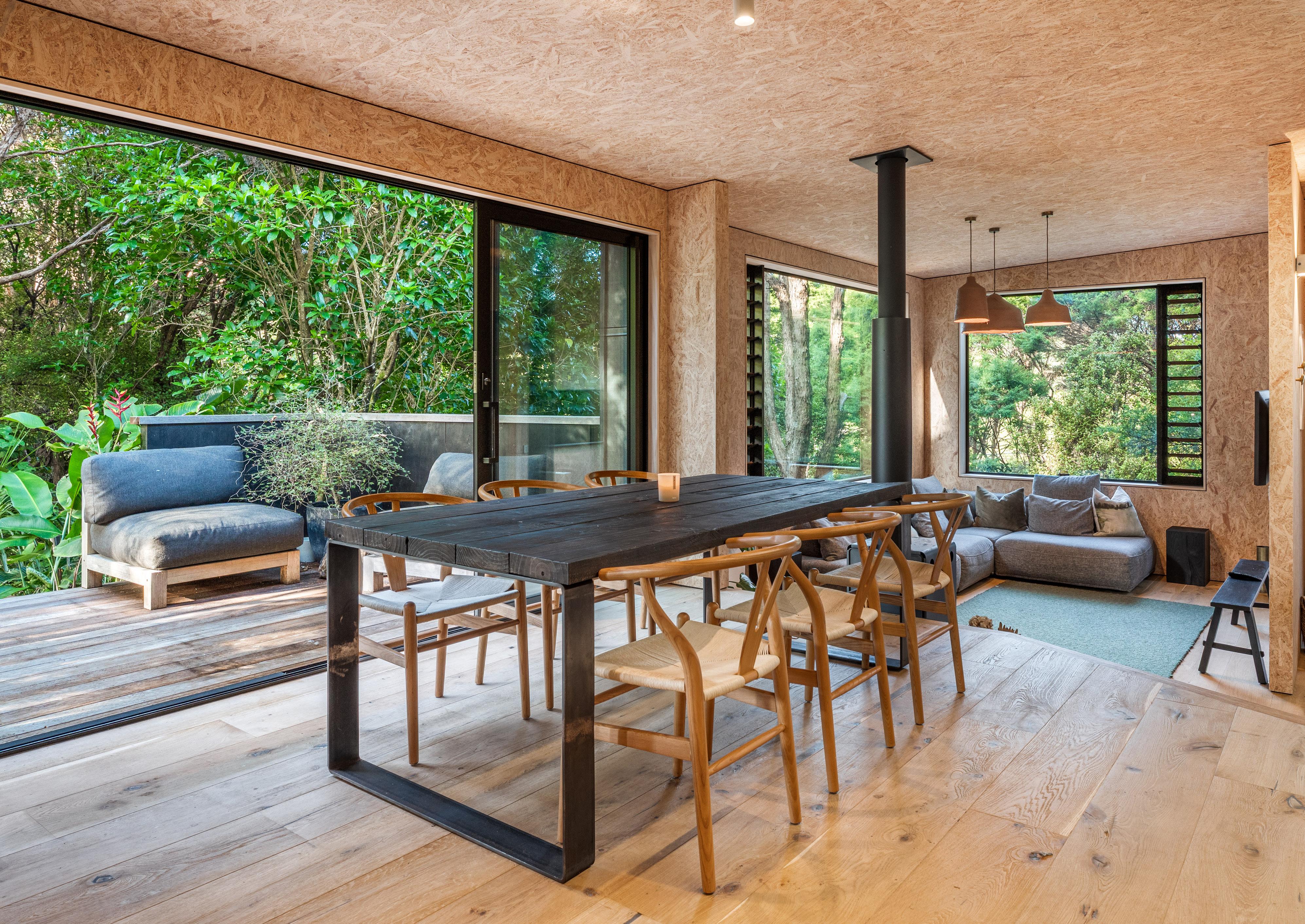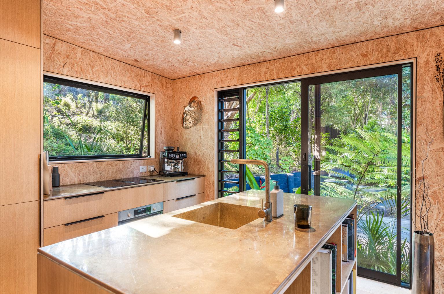 Inside, the atmosphere is tactile and deeply immersive. Textured strand board walls echo the rhythm of bark and branches beyond the windows, while raw oak floors, honed concrete and aged brass form a palette that feels elemental, warm and enduring. Large picture windows frame the surrounding canopy so closely that the forest becomes part of the interior experience.