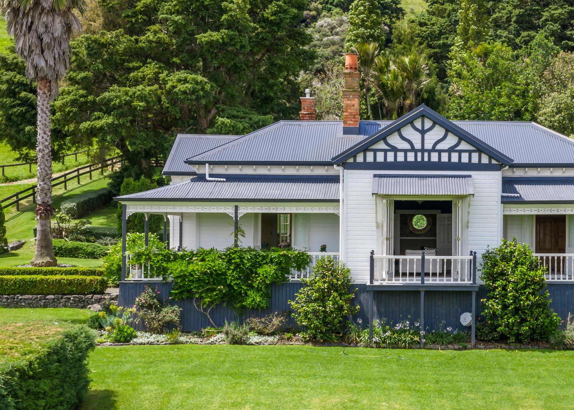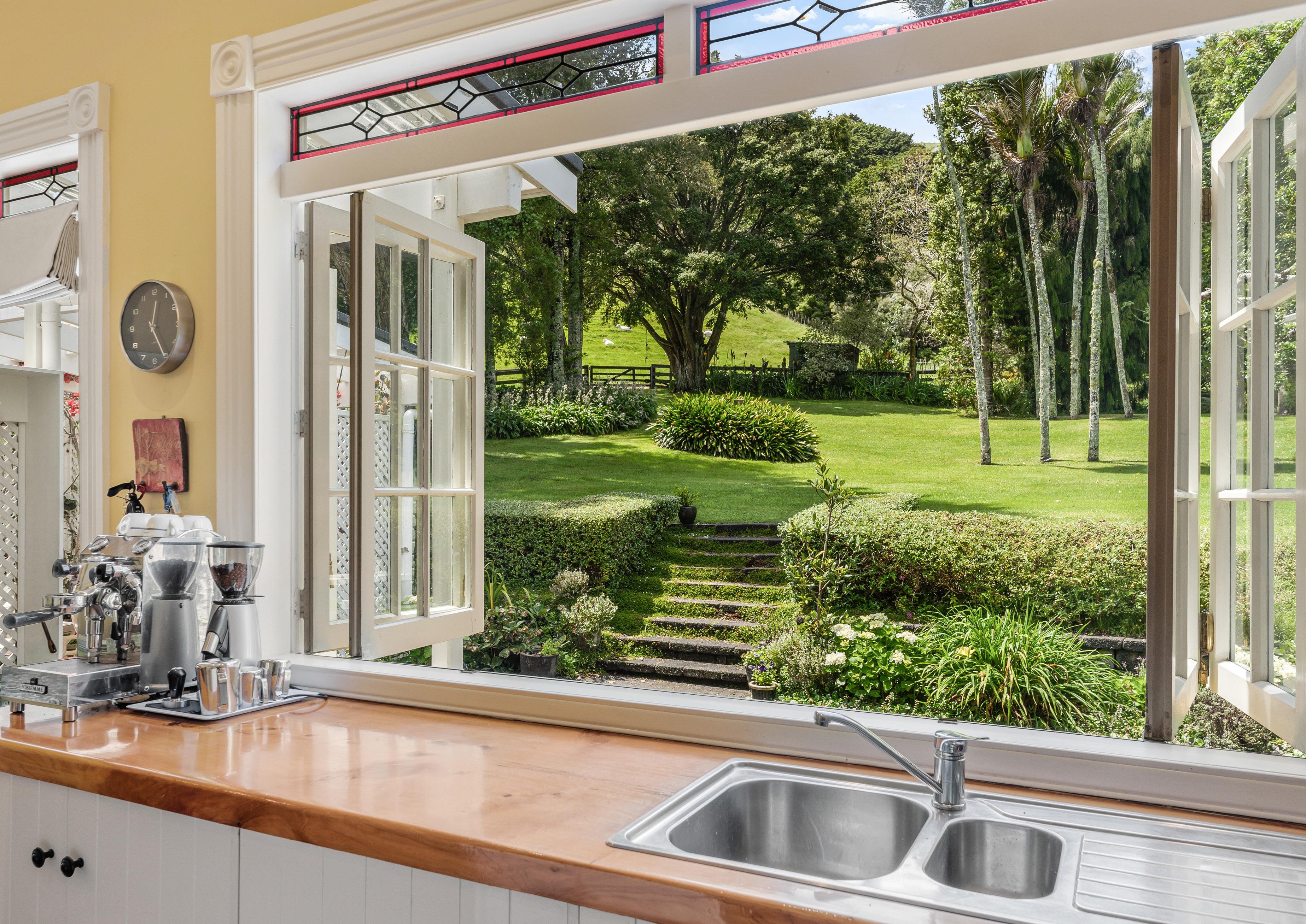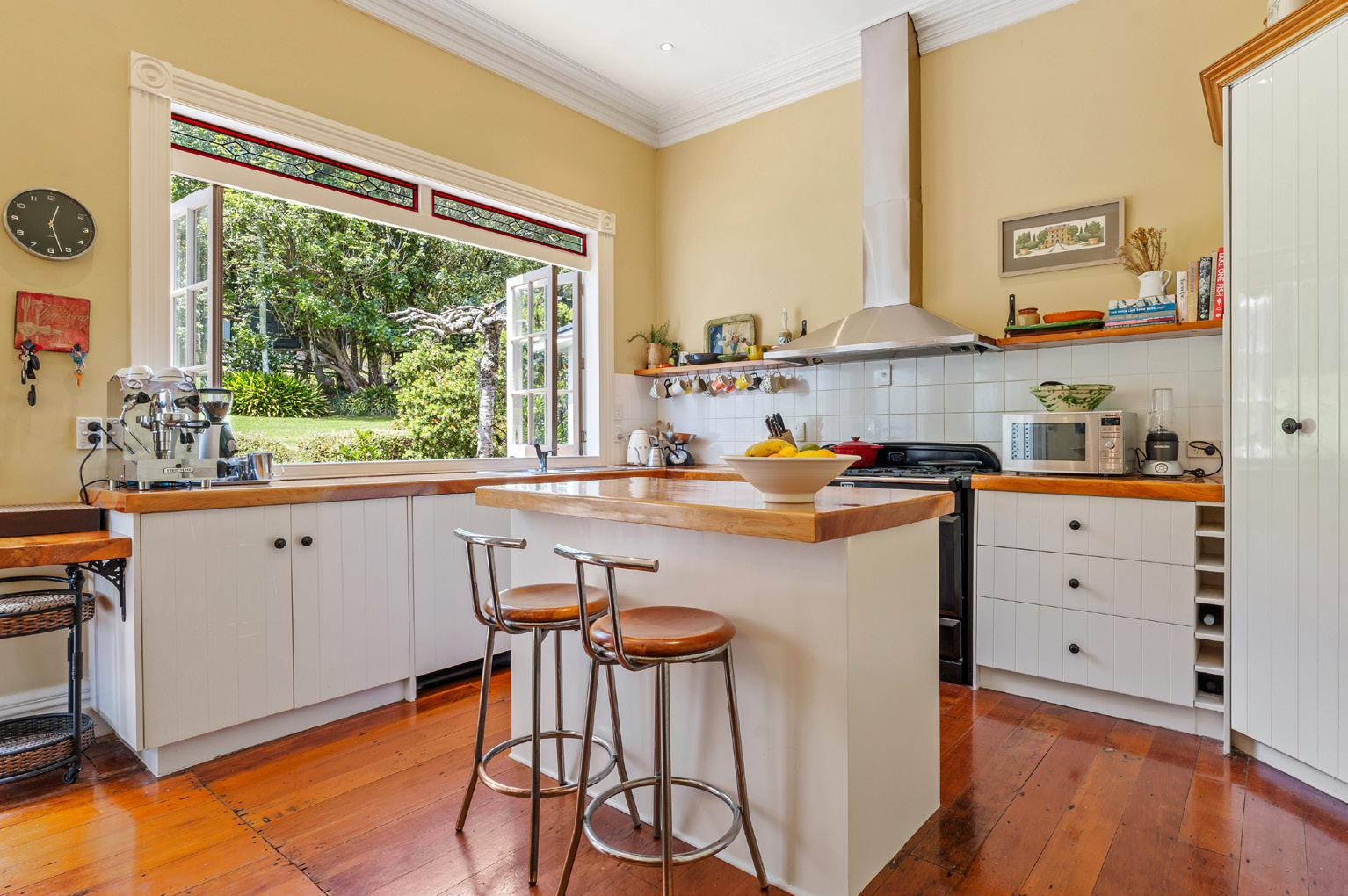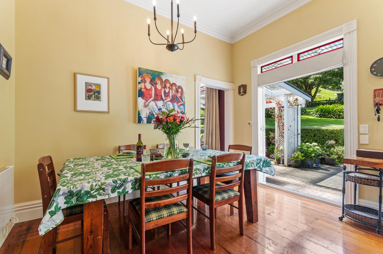 Moved from Mt Eden in 1988, the home has been re-sited with original features retained and the brick chimneys reinstated. New bifold doors and windows have been added to open the charming farmhouse kitchen and casual living area to a private, bricked courtyard, conservatory and stunning backyard garden perfect for outdoor entertaining. The garden is studded with mature native trees including Kauri,Puriri and a pretty stand of Nikau palms.