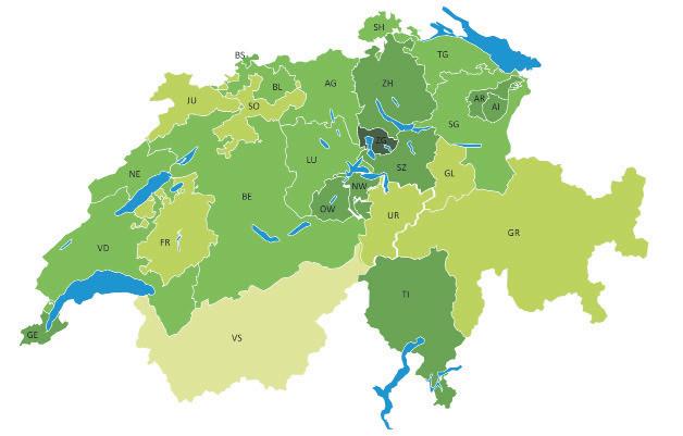 Durchschnittlicher ESG-Score nach Kanton, basierend auf über 500 000 im Handelsregister eingetragenen Firmen. Je dunkler das Grün, desto höher der ESG-Score.