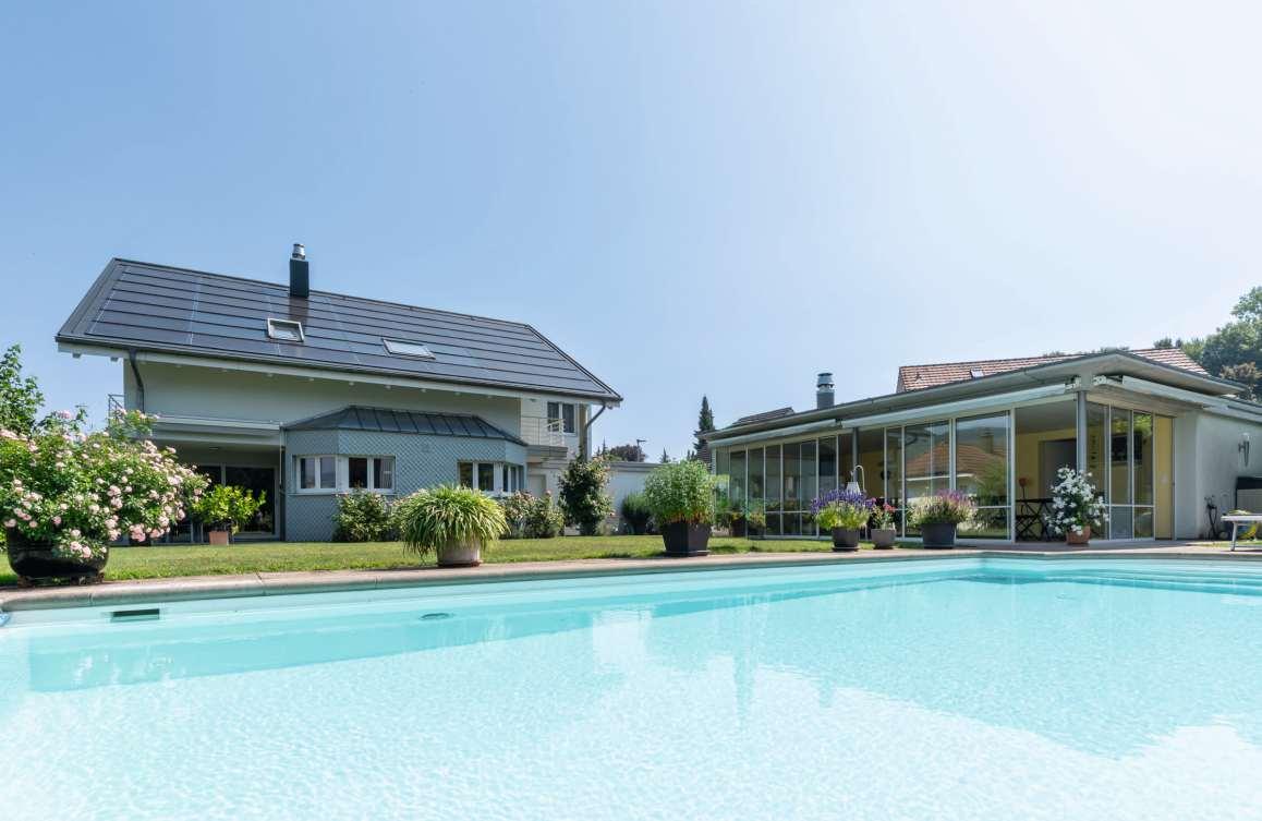 Hohe Decken und grosse Fensterfronten bieten einen Blick auf den mediterranen Garten. Der beheizte Salzwasserpool mitPoolhaus und Bar sorgt für Ferienatmosphäre.