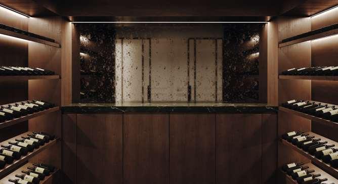 VondortführtderWegindieKüche,die StineHollesenalsromantischinterpretierten Boudoir-Raumkonzipierte.SämtlicheGeräte sinddiskrethinterelegantenFrontenverborgen,sodassdieFunktionindenHintergrund tritt und die Atmosphäre im Vordergrund steht.WandverzierungenverströmenWärme und Struktur, während die mintfarbene KochinselmitgerundetenEckenalsskulpturales Zentrum wirkt. Ein grosser Spiegel reflektiertdasLichtundlässtdenRaumnoch grosszügiger erscheinen. Selbst der angren-