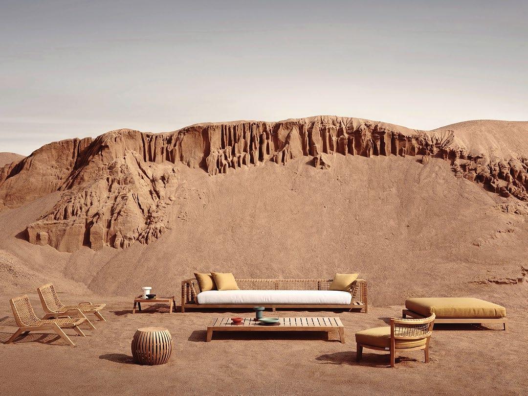 La collection iconique de la marque italienne de meubles de plein air Unopiu se nomme «Synthesis». Pour cette saison, elle a été mise en scène dans le paysage lunaire de l’Arizona avec de nouveaux tissus dans les teintes ocre, bleu indigo et bouclé rouge. Le canapé modulaire en teck et tissu résistant aux intempéries «Wa-ProLace» habille tout ce dont on a besoin pour un confortable coin salon: fauteuils, canapé et tables basses. Et en plus, des chaises longues et un lit à baldaquin.