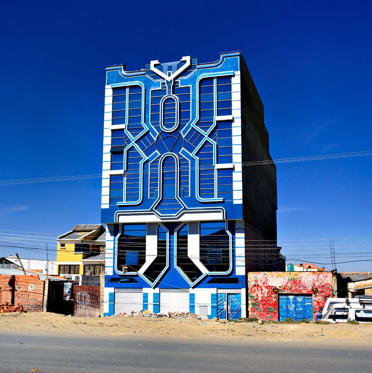 Perchée à plus de 4000 mètres d’altitude, la cité andine d’El Alto, en Bolivie, compte quelques-uns des immeubles les plus hauts en couleurs du monde. Ils ont été construits par Freddy Mamani Silvestre dont les réalisations anticonformistes s’inspirent de l’architecture pré-inca et de la culture vernaculaire du peuple Aymara, première population du pays. Par son style inimitable, l’architecte autodidacte de 52 ans – que d’aucuns considèrent déjà comme l’héritier d’Antoni Gaudi – évoque les mythes, les motifs et les formes des habitants du haut plateau. Certaines de ses plus de 60 maisons bigarrées servent de salones de eventos: dans leurs vastes salles aménagées pour des foules allant jusqu’à 1500 personnes, on fête et l’on danse. (David Strohm)