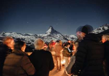 «Unser Glückist aber auch,dasswir kleinmit nurdrei Chaletsangefangenhaben.Das hatuns erlaubt, stets Neuesauszuprobieren»,sagtLauber. Unteranderem auch dielegendärenUnplugged-Konzerteauf derTerrasse. 2010 fand hier daserste KonzertimRahmendes Festivals statt–damalsintim mit50Besuchern,während draussen Schneeflockentanzten.Heute stehen an einem Konzert-Samstagnachmittagübertausend Menschen auf derTerrasse, dieSonnenbrillen Richtung Matterhorn gerichtet. Diespezielle Atmosphäre istabergeblieben: Sanfte Gitarrenklänge wehengegen dieBerge,Schnee glitzert in derSonne undSkifahrer gleitenhinterder Bühnedie Pistehinunter. «Jedes Jahr spürtman wieder dieseMagie:Musik,Berge,Sonne –das ergibt eine fast filmischeStimmung»,sagtLauber.