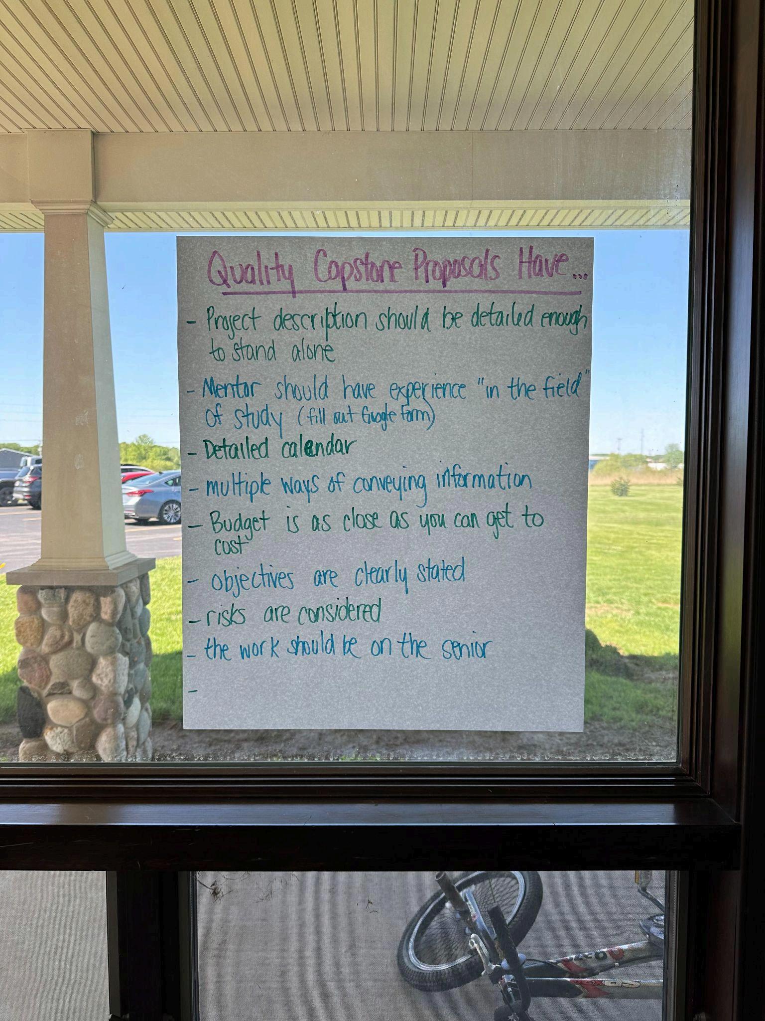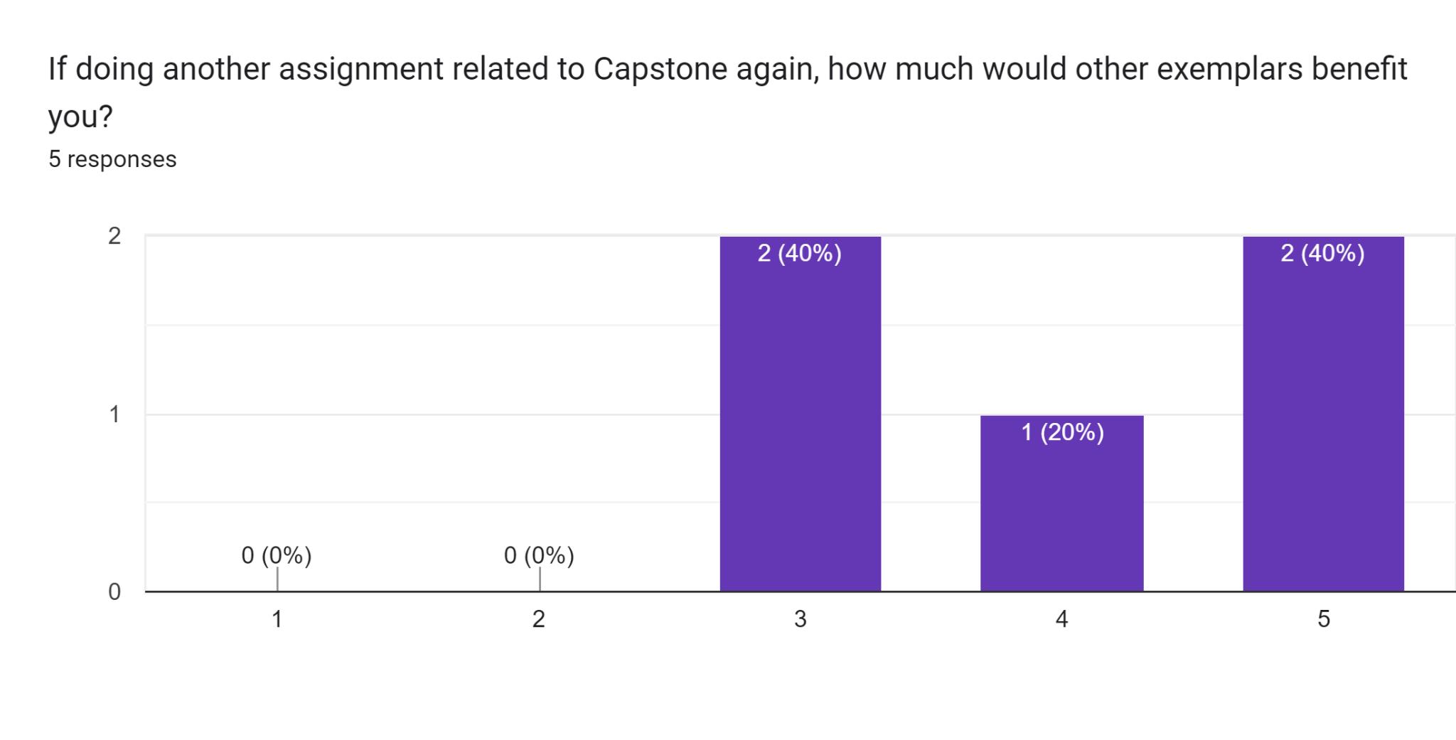 “For writing my proposal I used most of the exemplars that I thought looked the most neat and organized. I found Adaline and Hannah's proposals the most helpful for my work. Unfortunately I did not use the lesson but I always find that examples are the most useful to me in doing this work. I also thought the assignment description was confusing at the start but after I continued my work it began to make more sense. Sometimes work descriptions can be a little overwhelming but with the exemplars it made a lot more sense. If possible it would be extremely helpful to me to have more examples for future capstone work.”