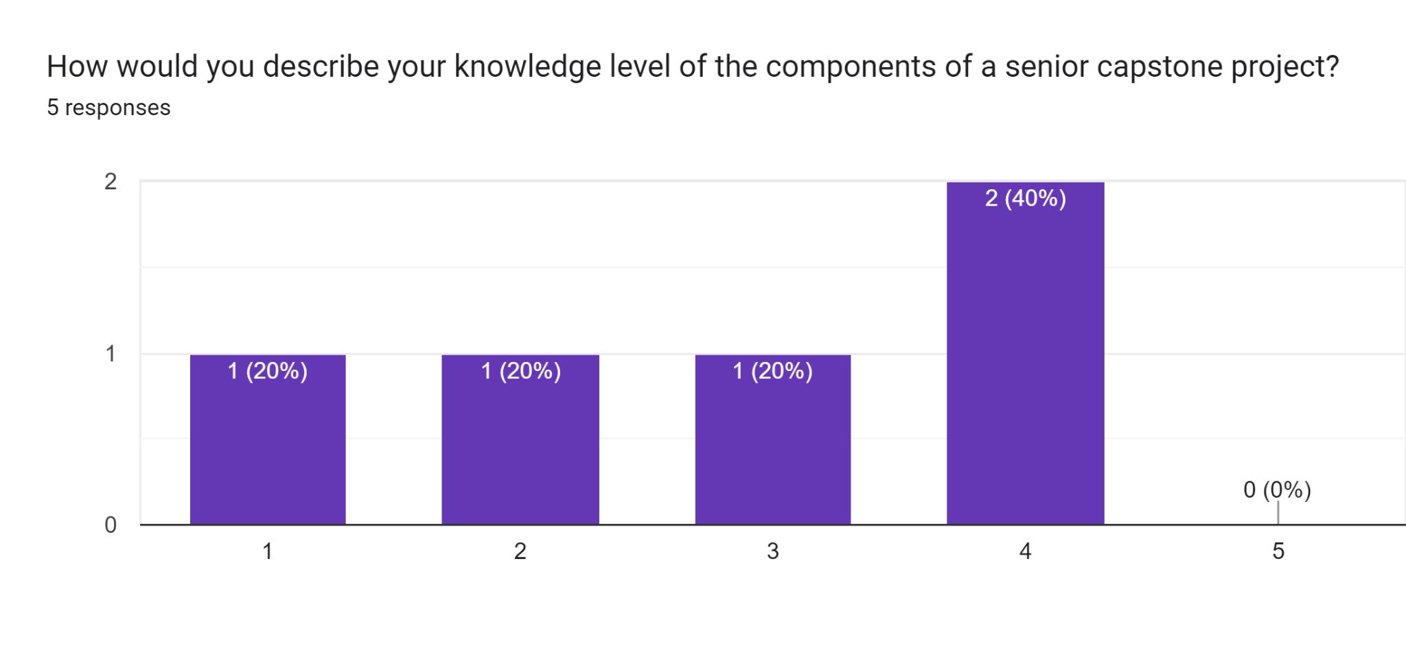 For our pre-survey data collection most responses were similar Knowledge of Capstone work overall was limited to numbers one through three, three being the most common. One response indicated “one” the most limited knowledge, three responses indicated “two”, and five responses indicated “three”. As the responses were located on the “A little” side of the scale, or primarily in the middle, it seems as though the Junior class overall knows some things about the Capstone process as a whole. They may be unsure, however, on most assignments and the process (Fig. 3). When questioning the Juniors on their knowledge of the components of a Capstone project, four people actually responded with a “one” acknowledging their limited knowledge on the components themselves. The amount of people selecting a specified number would decrease with each increase in number, three people responding with “two”, and two people responding with “three” (Fig. 4). Asking how much exemplars help the surveyors understand assignments, four people responded with a “four”, three people responded with a “three”, and two people responded with a “five”. It seems as though all the Juniors already appreciate in some form the level of knowledge exemplars provide in understanding and completing assignments (Fig 5). In asking about assignment descriptions in being helpful in understanding an assignment, most respondents (five people) gave a score of “four” meaning that assignment descriptions could possibly be the same weight in understanding assignments as exemplars. It also shows that assignment descriptions overall are pretty important. A surprising two respondents put a “one” and a “two” as responses, possibly finding that the descriptions on Google Classroom or other areas are not as important in completing assignments. Two people placed a “five” and probably heavily regard Google Classroom or other assignment descriptions when understanding assignments (Fig. 6). For the final question of direct teacher instruction helping to understand assignments five out of the nine respondents put a “five” being very important in understanding an assignment. Three placed a “four” marking its importance, that may not be the overwhelming only factor, and one responded a “two” maybe relying on other forms of understanding (Fig. 7).