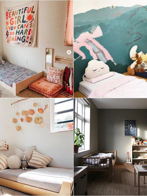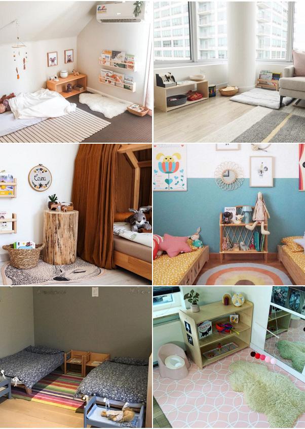 Child-sized furnishings are an important part of this design. A low bed, low hooks, accessible clothing rods, drawers or baskets for clothing, and low shelves for books, materials, and toys allow children to reach and use what they
