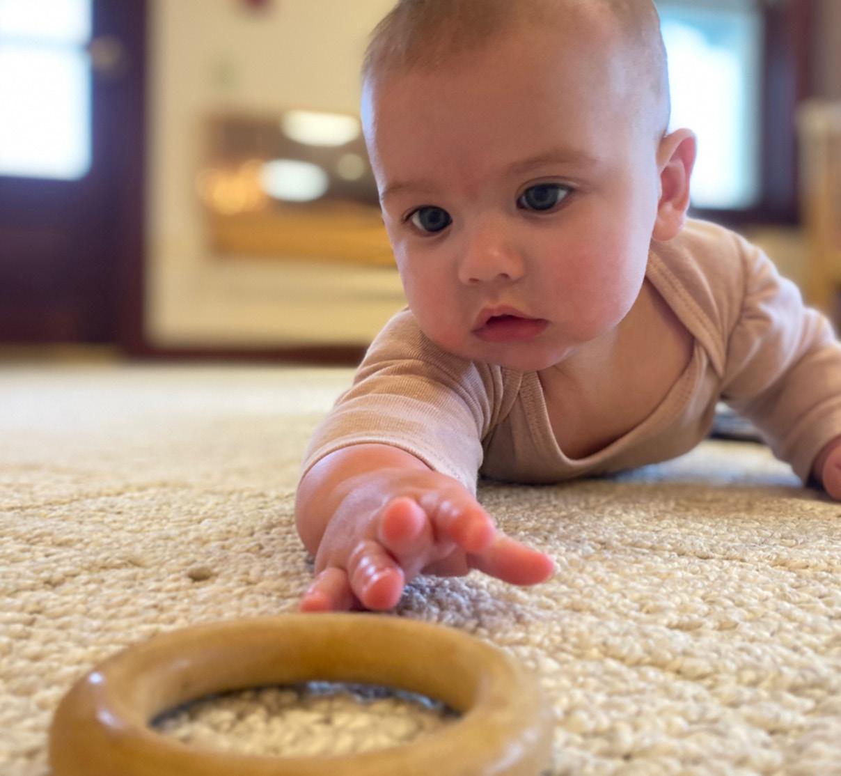 A Montessori floor bed allows an infant to enter and leave their bed independently, encouraging exploration and development in a safe environment. When planning the room, sit at the infant’s level to see the space from their perspective. Incorporate natural beauty from the outdoors to stimulate curiosity. As the infant begins making choices, provide options for clothing, toys, and food in low baskets, allowing them to select independently.