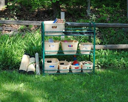 Continue the sense of order that has been created inside your home. A small inexpensive wire-shelving unit can be used with plastic bins to hold different items (chalk, jump ropes, bubbles, gardening tools, mud boots, etc.).