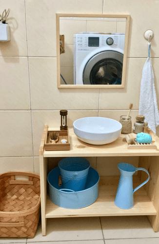 Keeping a small basket of face cloths in the bathroom encourages children to wash their face and hands after meals. Positioning a mirror at the child’s height also allows them to see themselves clearly and participate more fully in their care routines.
