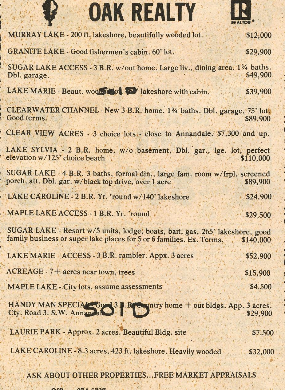 Oak Realty was founded in 1974 when Don Bruggeman purchased Daryl Gunnarson Realty, and changed the name to Oak Realty after its location on Oak Avenue, Annandale’s charmed Main Street. Our red and white leaf was born and along with it, a tradition of providing quality real estate service in the Heart of the Lakes area.