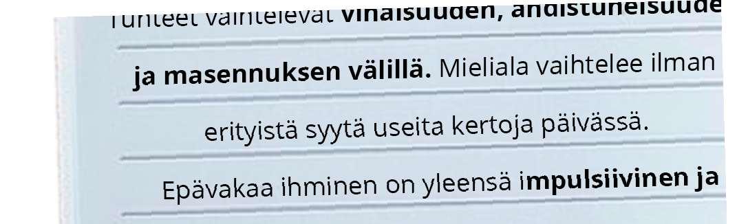 Epävakaa näyttäytyy jonkin verran arkielämässä, silloin kun menee tosi lujaa. Tunteet tuntuvat kymmenen kertaa kovempina kuin muilla ihmisillä. Minun pitää ylläpitää kuorta, vaikka sisällä kuohuu, ettei kulissi kaadu. Teen impulsiivisia päätöksiä, enkä mieti mitään kahta kertaa ennen kuin teen. Kun elämässä on kaoottinen tilanne, myös syömishäiriön oireet saattavat tulla mukaan muutamaksi päiväksi.