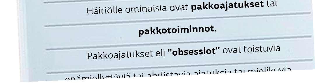 Diagnoosin sain vasta vähän aikaa siten. Käyn tällä hetkellä terapiassa. Itselläni OCD ei ole koskaan ollut niin paha, että tarvitsisin lääkkeitä. Terapialla ja altistamisharjoituksilla yritetään helpottaa oireita ja oppia elämään häiriön kanssa. Olen saanut terapiasta paljon apua. Olen oppinut, mitkä ovat pakkoajatuksia ja miten niitä hallitaan, etteivät ne olisi niin pakottavia ja jäisi päähän pyörimään. Olen oppinut mikä on sairaanloista pakkoajattelua ja tajunnut, etteivät ne ole normaaleita ajatuksia.