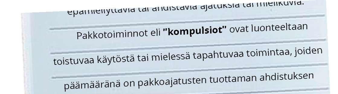 Lisäksi OCD ilmenee minulla järjestyspakkona. Kaiken pitää olla paikallaan tai suutun. Kaikkea on pakko tarkistella hirveästi. Jos lähden autoltani, minulla on tietty järjestys missä tarkistan asiat. Jos en pysty keskittymään siihen siinä hetkessä, se jää päähäni pakkoajatuksena ja mietin sitä kauan.