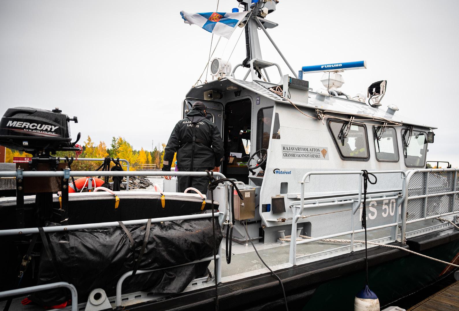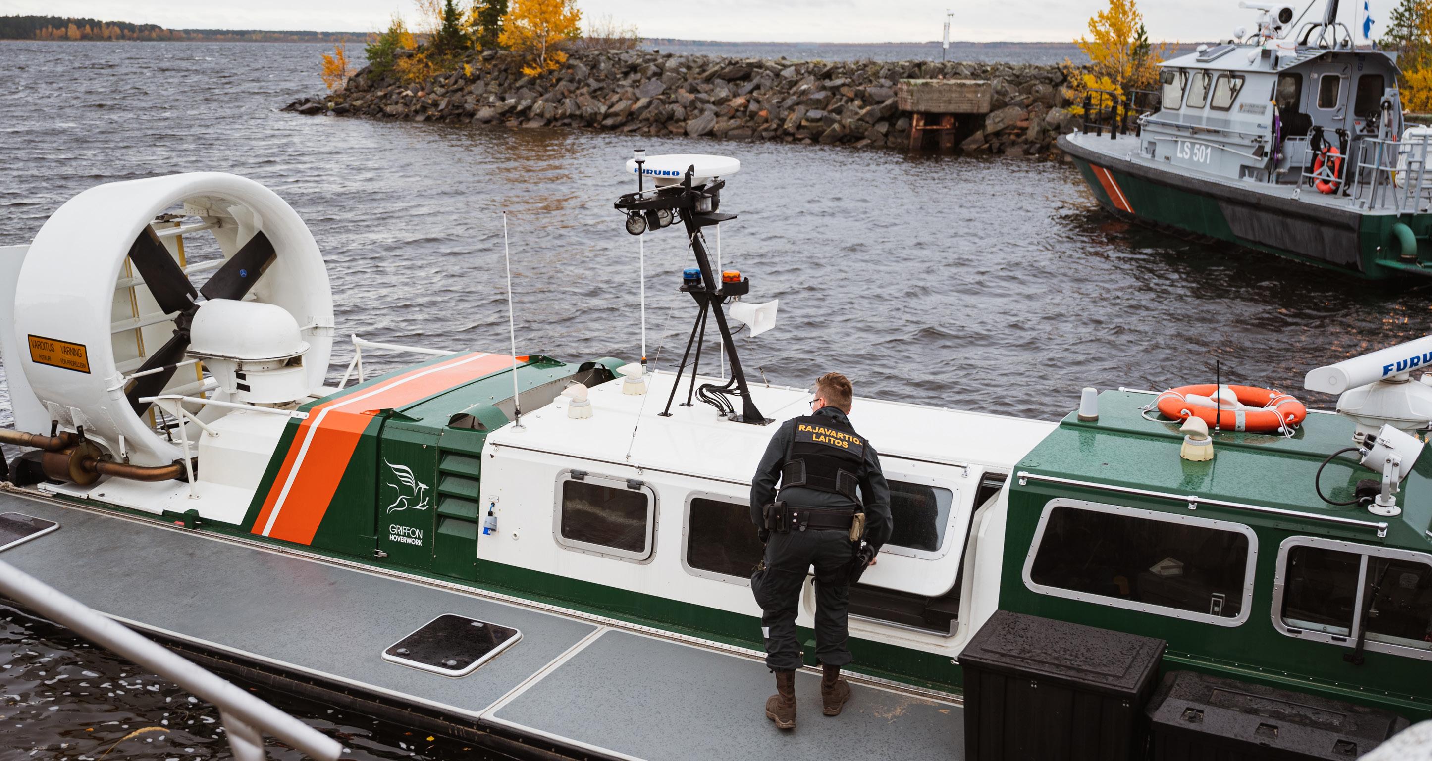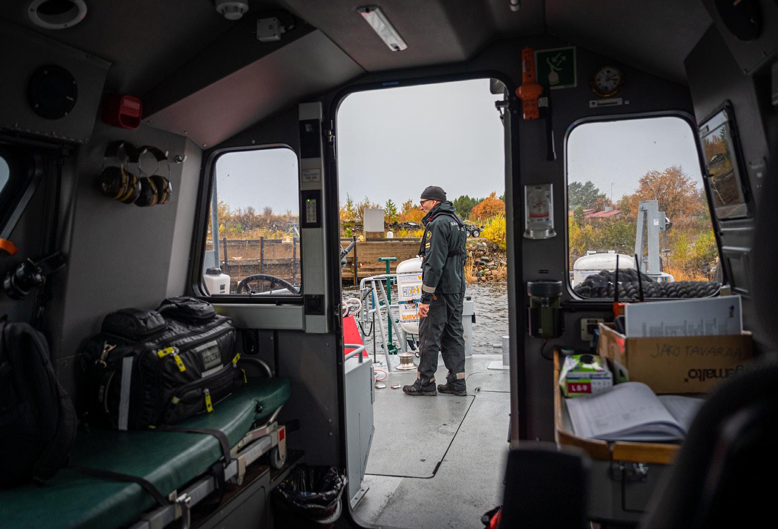 Ilmatyynyaluksen maihin nostamisen jälkeen siirrymme partioveneelle, jossa Mustakangas suorittaa liikkeellelähtötarkastuksen.