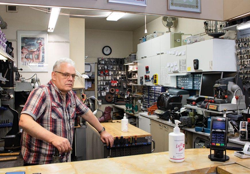 Yrittäjän työtilaa silmäillessä suurimman osan seinistä täyttävät kenkien ja koneiden lisäksi erilaiset avaimet ja oheistarvikkeet. Suutari on tietoisesti investoinut avainpuolelle laitehankintojen ja kouluttautumisen kautta.