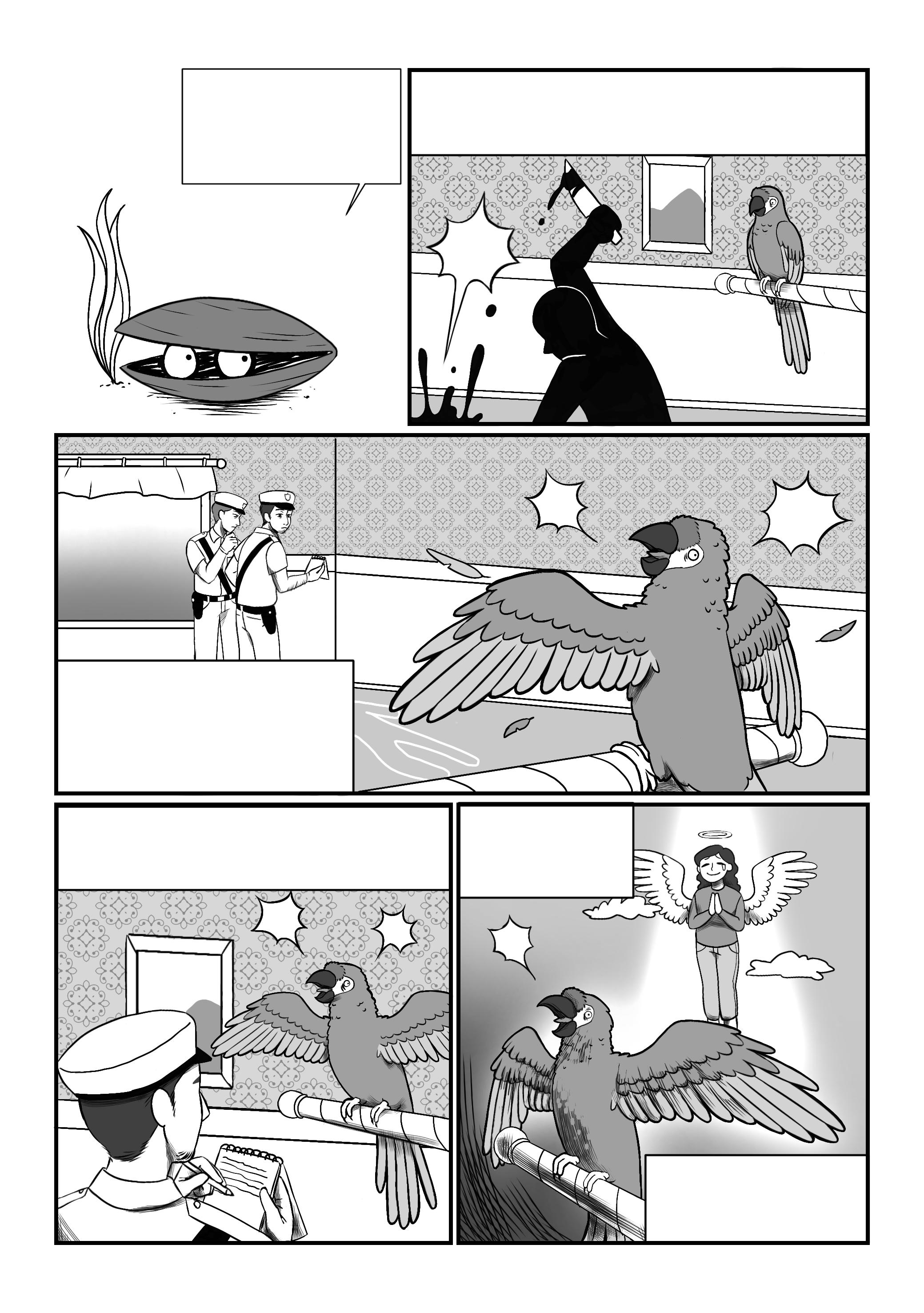 Rikoksen ainoa silminnäkijä oli uhrin papukaija, jonka rikospaikkaa vartioinut poliisi kuuli toistavan uhrin viimeisiä sanoja.