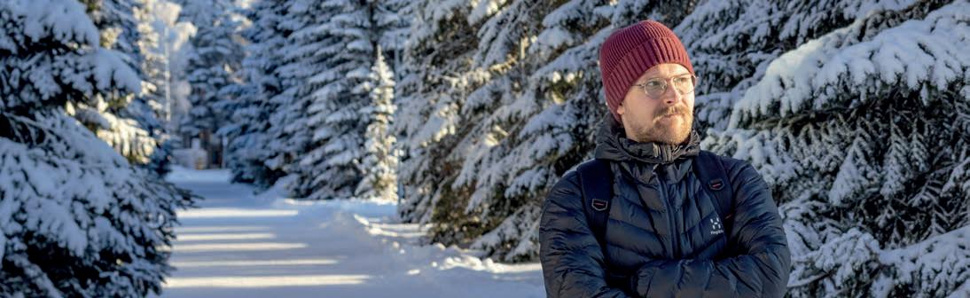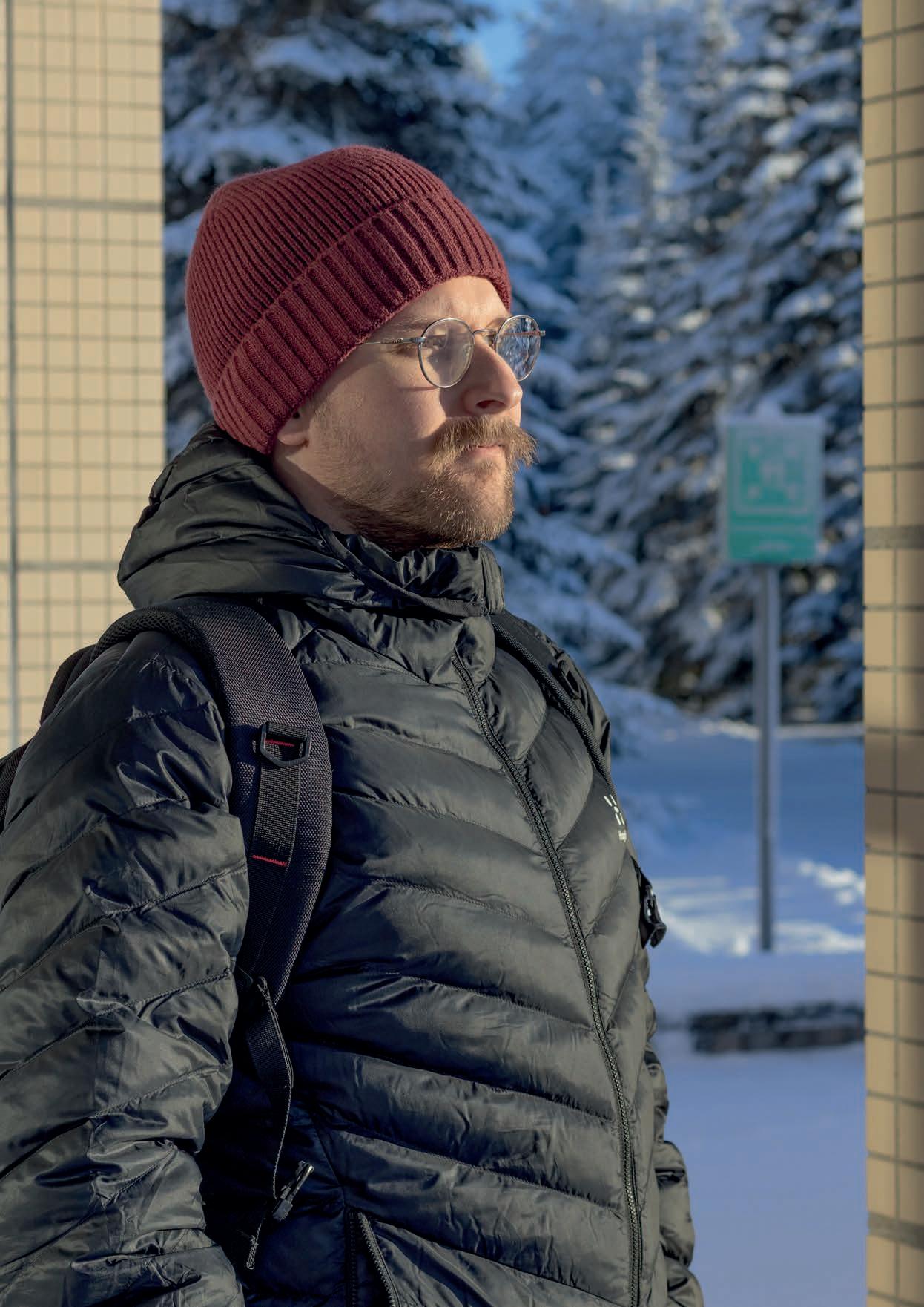 Pakkaspäivän aurinko taittuu Linnanmaan kampuksen ikkunoista ja säteilee suoraan silmiin. Häikäisevän väreilyn takaa erottautuu mies, joka on samaan aikaan sekä parrakas että viiksekäs.