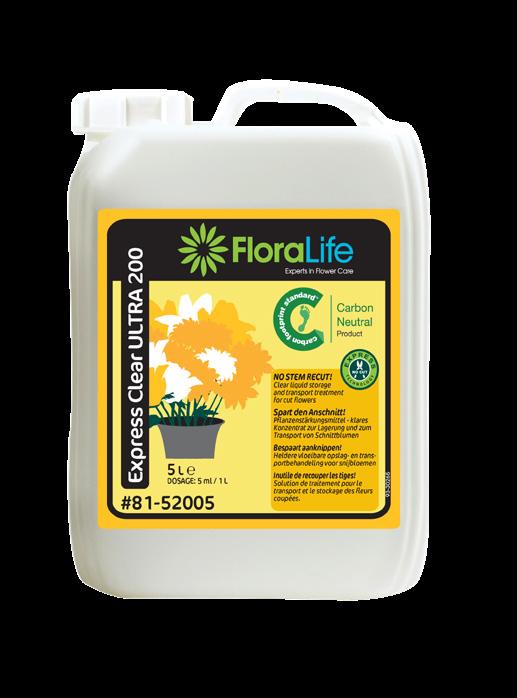 Die Versorgung mit allen notwendigen Nährstoffen ist von Anfang an, d.h. schon bei der Präsentation im Verkaufsraum, unabdingbar, damit die Schnittblumen lange frisch bleiben. Floralife® Express Clear ULTRA 200 ist hoch konzentriert, so dass nur 1 Liter für 200 Liter Wasser ausreicht. Floralife® Express Clear ULTRA 200 wirkt ohne Anscheiden der Blumenstiele, die Schnittblumen können nach der Anlieferung ohne weitere Verarbeitung direkt in den Verkaufsbehälter gestellt werden. Dieses Produkt ist Klimaneutral.