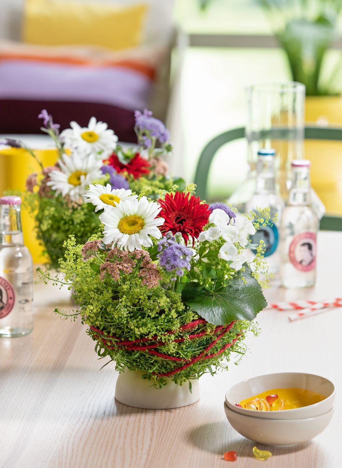 Achillea millefolium · Ageratum houstonianum Alchemilla mollis Galax urceolata · Gerbera jamesonii · Lavandula stoechas Leucanthemum maximum · Phlox paniculata · Thlaspi / Lepidium ’Green Bell’ Schnur · Schale
