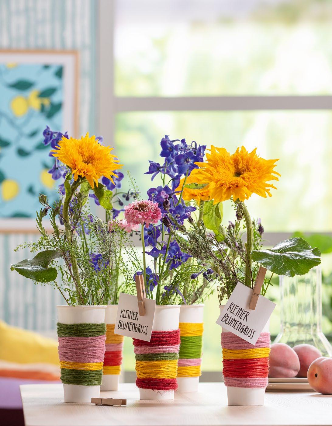 Delphinium Cultivar Galax urceolata Helianthus annuus · Lavandula stoechas · Scabiosa atropurpurea · Thlaspi / Lepidium ’Green Bell’ Pappbecher · Schnur · Pappe Filzmarker · Holz-Wäscheklammer OASIS ® Maxlife Ziegel, NatureSource™ Floral Foam, OASIS ® DoubleFix Clear (beides OASIS ® Floral Products)