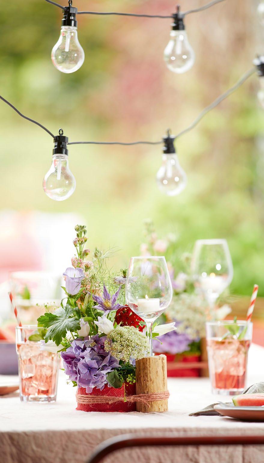 Dieses Bündel mit der Halterung am Glasrand festklemmen und die Steckschaumbasis mit den Sommerblumen bestecken. Kerze ins Glasgefäß einsetzen, Boden mit Granulat bedecken, zarte Blütenstiele auf Glasboden dekorieren, darauf achten, dass die Blüten nicht an die Kerzenflamme kommen.