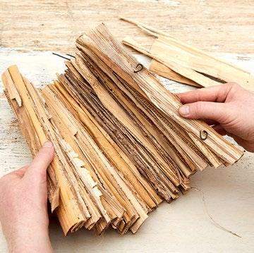 Den Trockenblumensteckschaum-Ziegel ellipsenförmig zuschneiden. Die Form mit Furnier umlegen, dieses mit Heißkleber fixieren und darauf achten, dass ein höherer Rand stehen bleibt. Furnier mit Schnur umwickeln. Gewässerte Steckschaumschale einsetzen und die Floralien einstecken.