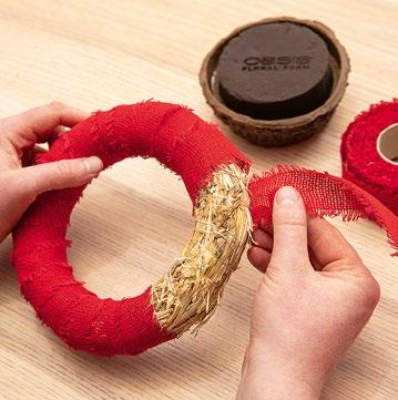 Zunächst die Kranzunterlage mit Band umwickeln. Die Schale mit dem gewässerten Steckschaum mittig in die Kranzunterlage einsetzen. Abschließend rundherum mit Schnüren umwickeln und die Floralien in den Steckschaum einarbeiten.