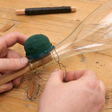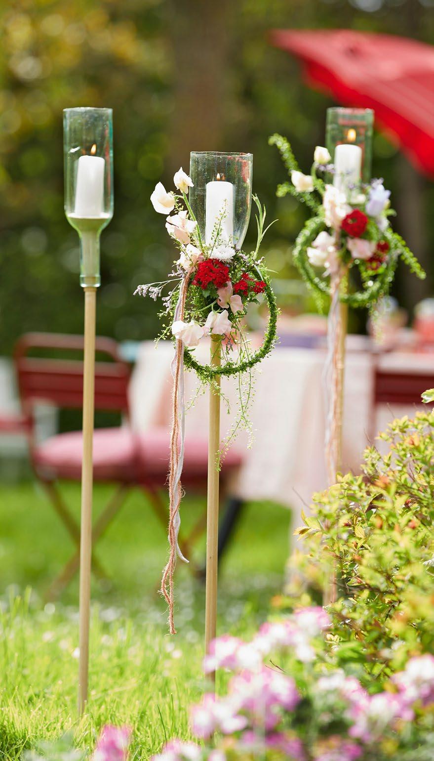 Zuerst den Flaschenboden mithilfe eines Glasschneiders abtrennen. Das lange Rundholz als Stecken in den Flaschenhals stecken, fixieren und gewässerten Mini Deco mit Bindedraht am unteren Flaschenende befestigen. Die Blumen hier einstecken, Bänder anknoten und aus Lepidium mithilfe des Bindedrahtes einen Kranz wickeln und diesen am Werkstück festknoten. Eine Kerze in die Flasche einsetzen und ggf. den Boden noch mit Granulat bedecken.