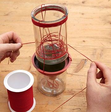 Zunächst die Kunststoffschale der Steckbasis mit Farbspray kolorieren und trocknen lassen. Schnur in drei gleichlange Stücke schneiden. Seitlich in den Rand der Schale drei Löcher bohren, hier die Schnüre durchziehen, diese oberhalb als Aufhängung zusammenführen und verknoten und im unteren Bereich eine Holzperle als Stopper einfügen. Den gewässerten Frischblumensteckschaum in die Schale einsetzen, das Glas am Boden mit Pini KL versehen und damit auf den Steckschaum stecken. Das Glas mit Schnur umwickeln, dabei darauf achten, dass die Aufhängung im oberen Bereich mit eingebunden wird. Dann die Blumen im unteren Bereich einfügen und eine Kerze einsetzen.