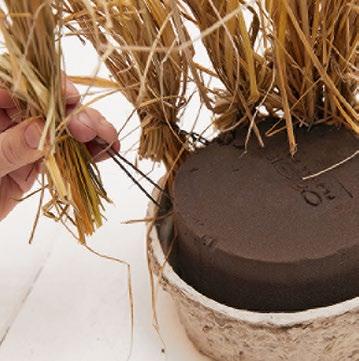 Den OASIS ® BLACK BIOLIT® Pflanzring zur Hälfte mit dem gewässerten OASIS ® TerraBrick™ Floral Media füllen. Die andere Hälfte des Rings mit Moos bedecken und anschließend den gesamten Pflanzring mit Gräsern und Ranken umwickeln, wobei die Fläche des Frischblumensteckschaums frei bleibt. Darin die Floralien in den Steckschaum einstecken.