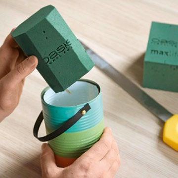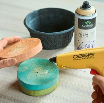Oasis ® NatureSource ™ Floral Foam, OASIS ® BLACK BIOLIT® Pflanzschale, OASIS ® AQUA COLOUR Spray, Heißkleber (alles OASIS ® Floral Products)