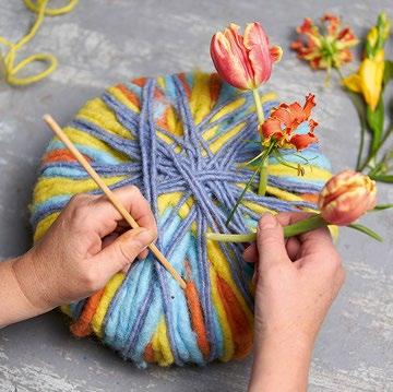 Den Steckschaum aus der Venezia-Schale nehmen und wässern. Inzwischen den Schalenrand mit doppelseitigem Klebeband umkleben. Den gewässerten Steckschaum wieder einsetzen, dann Wollschnüre in verschiedenen Farben über die Schale wickeln, bis diese dicht mit den bunten Wollfäden überzogen ist. Nun die Floralien zwischen die Wollschnüre stecken, dafür ggf. einen Splittstab zur Hilfe nehmen.