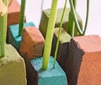 Dann aus diesem Block verschiedene Säulenformen schnitzen, diese mit der Sprühfarbe kolorieren, ggf. dazu mit Kreppband teilweise abkleben, sodass saubere Linien zwischen den Farbflächen entstehen. Alles trocknen lassen. Den Steckschaum wässern, Pinholder in der Glasschale mithilfe von Oasis Fix fixieren, den Steckschaum darauf befestigen und die Floralien einfügen.