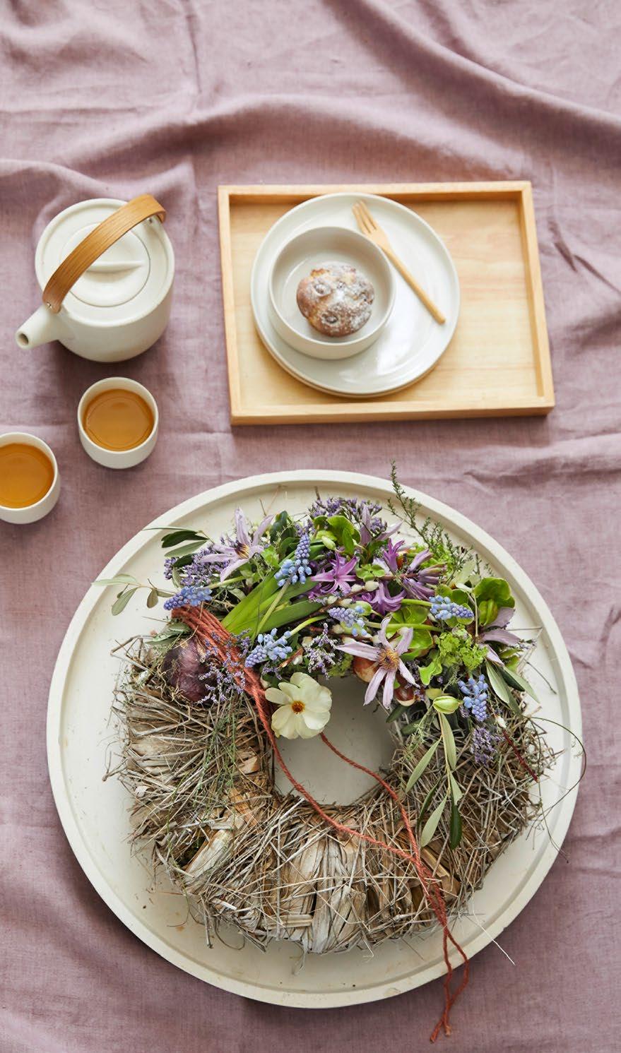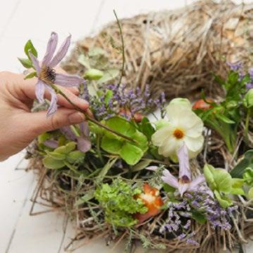 Clematis Cultivar · Galium aparine Helleborus orientalis ’Magnificent Bells’ · Hyacinthus orientalis Limonium tetragonum · Muscari armeniacum · Olea europaea · Ranunculus asiaticus ’Butterfly’ Salix caprea · Thymus vulgaris Viburnum opulus · Tulpenzwiebeln getrocknete Gräser · Ranken Moos