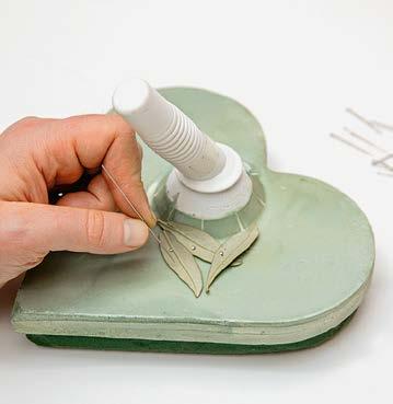 Baumscheibe als Abstandshalter unter die gewässerte Steckunterlage schrauben. Blätter der Schusterpalme an der Steckunterseite festtackern. Blattspitzen mit Stecknadeln an der Innenseite der Unterlage befestigen. Floralien einarbeiten und die Urne mittig platzieren.